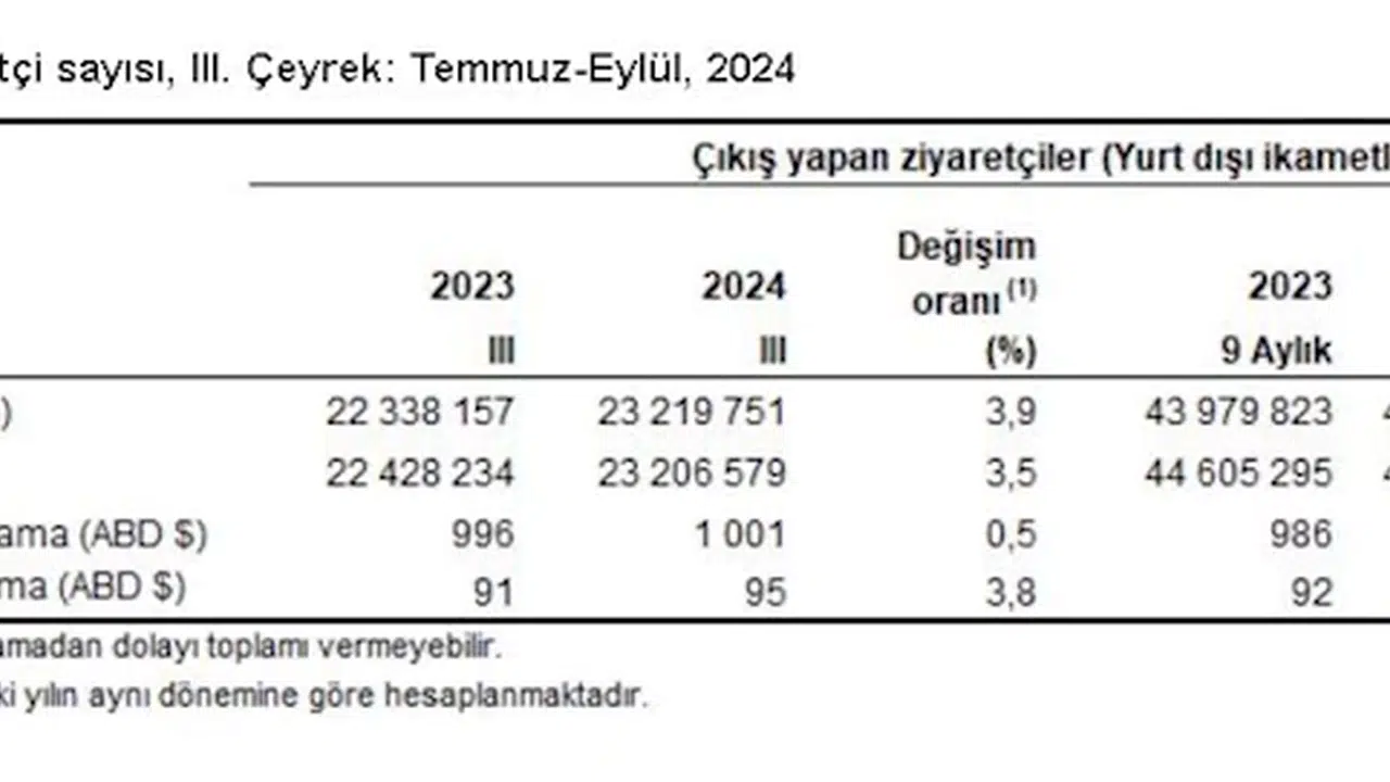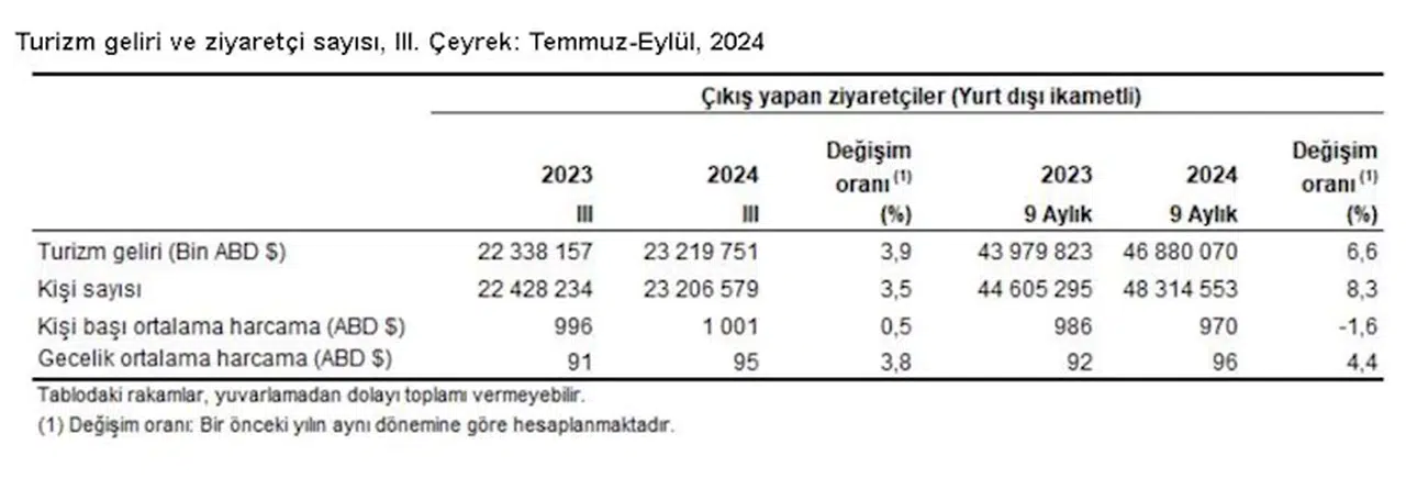 TÜİK, 3'üncü çeyrek turizm istatistiklerini açıkladı. Buna göre; turizm geliri 3'üncü çeyrekte bir önceki yılın aynı çeyreğine göre yüzde 3,9 artarak 23 milyar 219 milyon 751 bin dolar oldu. Turizm gelirinin yüzde 14,7'si Türkiye'yi ziyaret eden yurt dışı ikametli gurbetçi vatandaşlardan elde edildi. 3'üncü çeyrekte yapılan harcamaların 15 milyar 77 milyon 957 bin dolarını kişisel harcamalar, 8 milyar 141 milyon 794 bin dolarını ise paket tur harcamaları oluşturdu. Türkiye'den çıkış yapan ziyaretçi sayısı 2024 yılı 3'üncü çeyreğinde bir önceki yılın aynı çeyreğine göre yüzde 3,5 artarak 23 milyon 206 bin 579 kişi oldu. Ziyaretçilerin yüzde 12,2'sini 2 milyon 835 bin 74 kişi ile gurbetçi vatandaşlar oluşturdu. 3'üncü çeyrekte Türkiye'den çıkış yapan ziyaretçilerin gecelik ortalama harcaması 95 dolar oldu. Yurt dışında ikamet eden vatandaşların gecelik ortalama harcaması ise 62 dolar oldu.