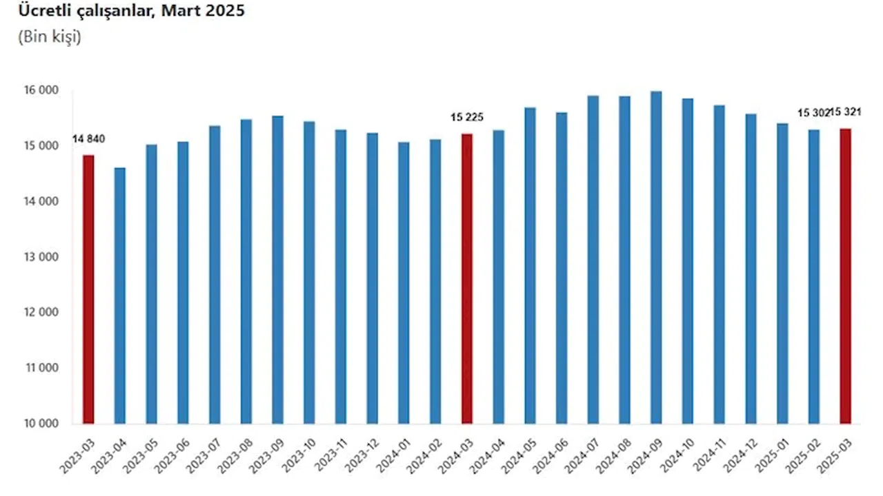 TÜİK, Mart 2025 dönemine ilişkin ücretli çalışan istatistiklerini açıkladı. Buna göre; sanayi, inşaat ve ticaret-hizmet sektörleri toplamında ücretli çalışan sayısı bir önceki yılın aynı ayına göre yüzde 0,6 arttı. Ücretli çalışan sayısı bir önceki yılın aynı ayında 15 milyon 224 bin 973 kişi iken, 2025 yılı Mart ayında 15 milyon 320 bin 987 kişi oldu. Ücretli çalışanların alt detaylarına bakıldığında; 2025 Mart ayında ücretli çalışan sayısı yıllık olarak sanayi sektöründe yüzde 2,6 azaldı, inşaat sektöründe aynı kaldı ve ticaret-hizmet sektöründe yüzde 2,7 arttı.