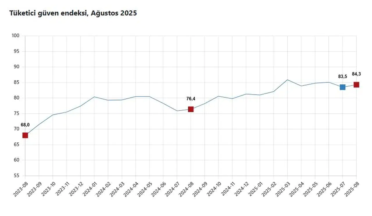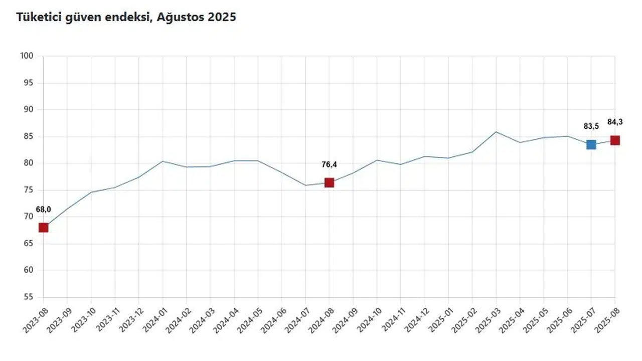 TÜRKİYE İstatistik Kurumu (TÜİK), tüketici güven endeksinin ağustosta yüzde 0,9 oranında artarak 84,3 olduğunu açıkladı.