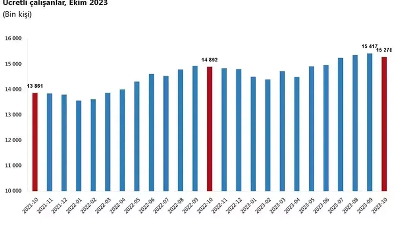TÜİK, Ekim 2023 dönemine ilişkin ücretli çalışan istatistiklerini açıkladı. Buna göre; sanayi, inşaat ve ticaret-hizmet sektörleri toplamında ücretli çalışan sayısı, ekim ayında bir önceki yılın aynı ayına göre yüzde 2,6 arttı. Ücretli çalışan sayısı bir önceki yılın aynı ayında 14 milyon 891 bin 949 kişiyken, 2023 yılı Ekim ayında 15 milyon 277 bin 929 kişi oldu. Ekim ayında ücretli çalışan sayısı yıllık olarak sanayi sektöründe yüzde 0,6 azaldı, inşaat sektöründe yüzde 12,2 ve ticaret-hizmet sektöründe yüzde 2,7 arttı.