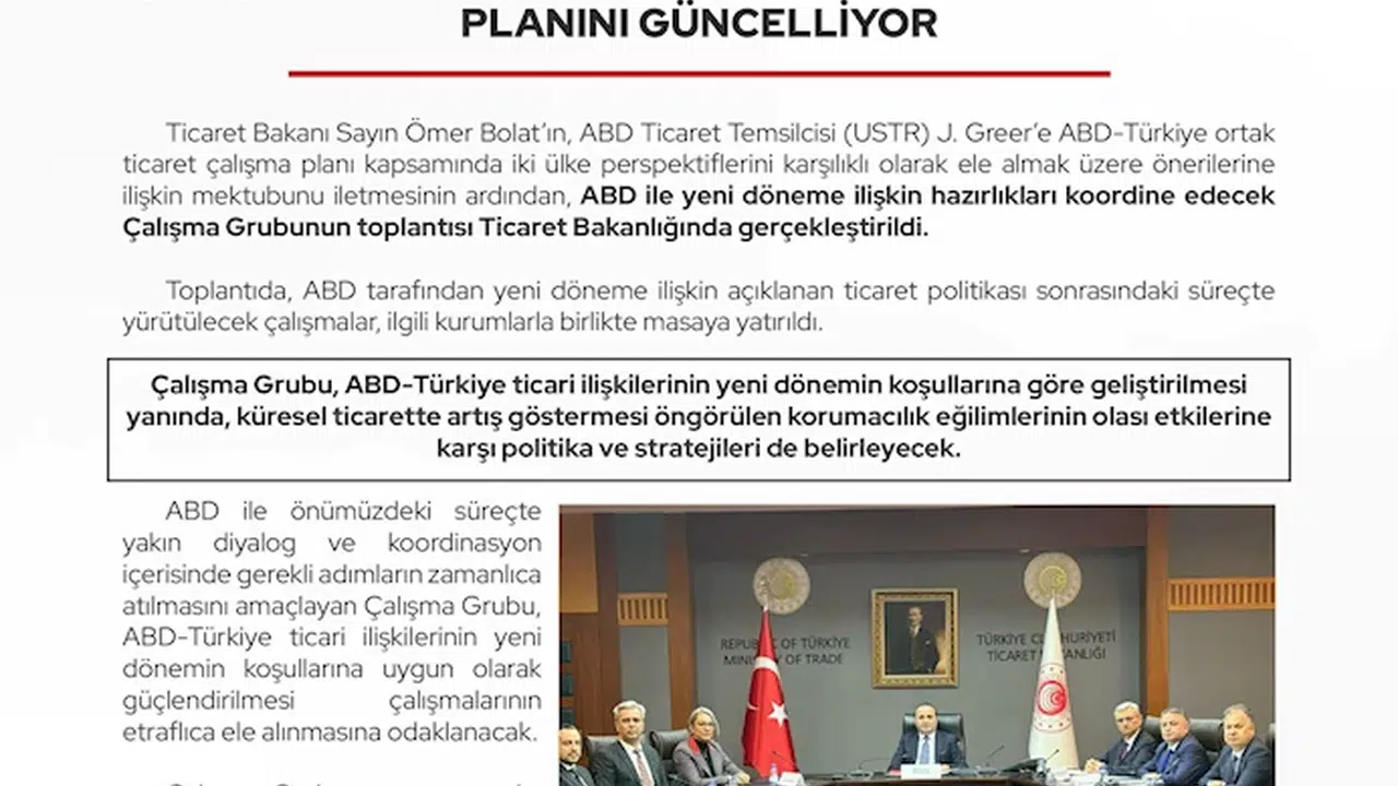 Ticaret Bakanı Ömer Bolat'ın, ABD Ticaret Temsilcisi J. Greer'e, ABD-Türkiye ortak ticaret çalışma planı kapsamında iki ülke perspektiflerini karşılıklı olarak ele almak üzere önerilerine ilişkin mektubunu iletmesinin ardından, ABD ile yeni döneme ilişkin hazırlıkları koordine edecek Çalışma Grubunun toplantısı gerçekleştirildi. Bakan Yardımcısı Mustafa Tuzcu başkanlığında yapılan toplantıda, ABD tarafından yeni döneme ilişkin açıklanan ticaret politikası sonrasındaki süreçte yürütülecek çalışmalar, ilgili kurumlarla birlikte ele alındı. Çalışma Grubu, ABD-Türkiye ticari ilişkilerinin yeni dönemin koşullarına göre geliştirilmesi yanında, küresel ticarette artış göstermesi öngörülen korumacılık eğilimlerinin olası etkilerine karşı politika ve stratejileri de belirleyecek. ABD ile önümüzdeki süreçte yakın diyalog ve koordinasyon içerisinde gerekli adımların zamanlıca atılmasını amaçlayan Çalışma Grubu, ABD-Türkiye ticari ilişkilerinin yeni dönemin koşullarına uygun olarak güçlendirilmesi çalışmalarının etraflıca ele alınmasına odaklanacak. Çalışma Grubunun aynı zamanda, küresel ticarette artış göstermesi öngörülen korumacılık eğilimlerinin olası etkilerine karşı plan, politika ve stratejilerin belirlenmesini de hedeflediği belirtildi.