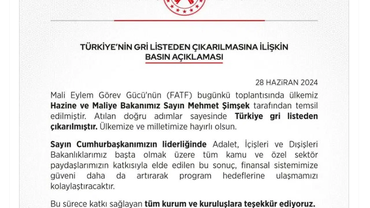 FATF'nin bugün yapılan toplantısında Türkiye'yi Hazine ve Maliye Bakanı Mehmet Şimşek temsil etti. Toplantıda, Türkiye'nin gri listeden çıkarılmasına karar verildi. Bakan Şimşek, kararın ardından sosyal medya hesabından 'Başardık' mesajını paylaştı. Hazine ve Maliye Bakanlığı da ardından açıklama yaptı. Açıklamada, bugün yapılan toplantıda Türkiye'nin Hazine ve Maliye Bakanı Mehmet Şimşek tarafından temsil edildiği belirtilerek, "Atılan doğru adımlar sayesinde Türkiye gri listeden çıkarılmıştır. Ülkemize ve milletimize hayırlı olsun. Sayın Cumhurbaşkanımızın liderliğinde Adalet, İçişleri ve Dışişleri Bakanlıklarımız başta olmak üzere tüm kamu ve özel sektör paydaşlarımızın katkısıyla elde edilen bu sonuç, finansal sistemimize güveni daha da artırarak program hedeflerine ulaşmamızı kolaylaştıracaktır. Bu sürece katkı sağlayan tüm kurum ve kuruluşlara teşekkür ediyoruz. Türkiye terörizmin finansmanı ve kara paranın aklanmasıyla mücadelesini bundan sonra da uluslararası standartlarla tam uyum içinde kararlılıkla yürütecektir. Bu çerçevede, MASAK ve diğer kurumların idari ve teknik kapasitesi daha da güçlendirilecek; gerektiğinde yasal ve idari düzenlemeler aynı hassasiyetle hayata geçirilecektir" denildi.