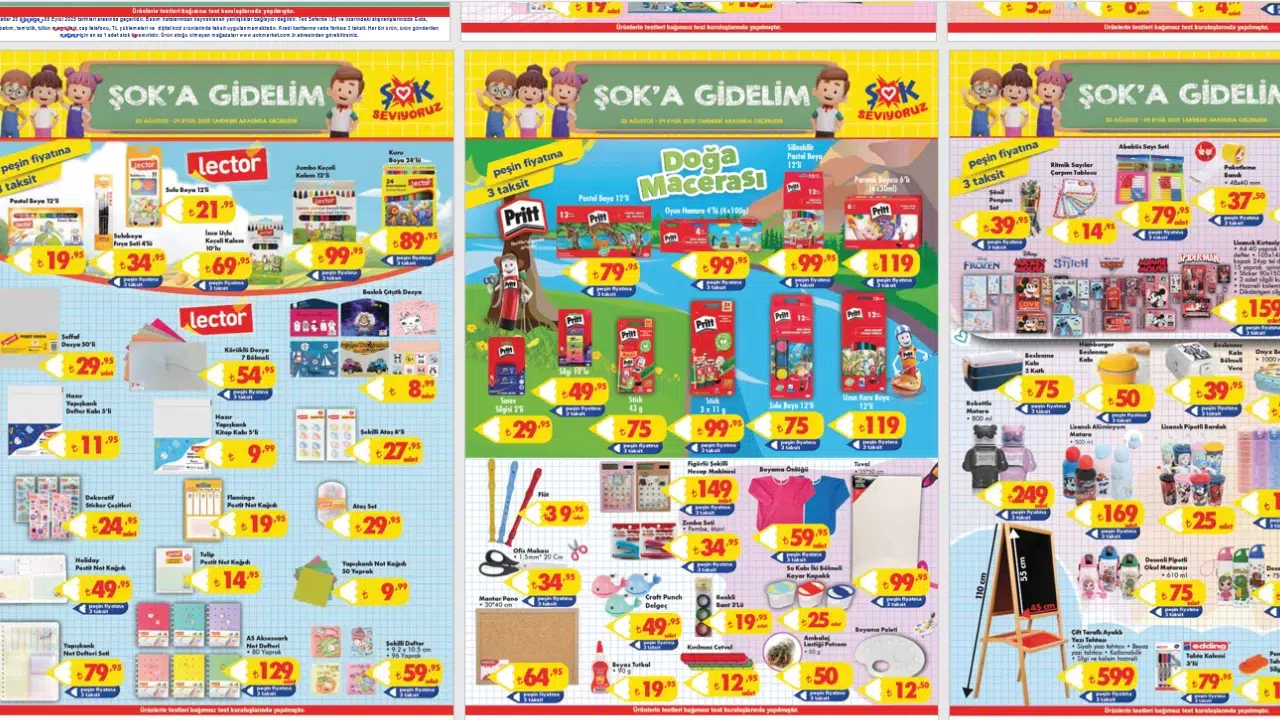 📅 23 Ağustos Cumartesi günü başlayacak olan ŞOK Market’in yeni fırsat kampanyası, okul sezonuna hazırlanan öğrenciler ve aileler için büyük avantajlar sunuyor. 20 Ağustos – 9 Eylül 2025 tarihleri arasında geçerli olacak katalog ile defterden çantaya, boyalardan kalemlere kadar pek çok kırtasiye ürünü indirimli fiyatlarla raflarda yerini alıyor.