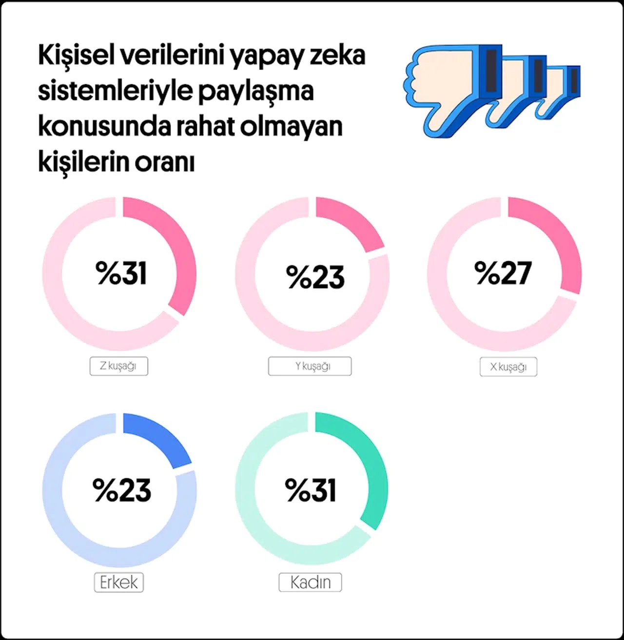 Öte yandan öğrencilerin yüzde 73'ü, yapay zeka kullanımıyla ilgili endişeli olduklarını dile getirdi. Yapay zeka tabanlı öğrenme süreçlerine ilişkin en büyük endişenin 'insan etkileşimi' olduğunu dile getiren Mustafa Ali Sivişoğlu, “Öğrenciler, gerçek öğretmenlerle öğrenirken motivasyon için daha önemli ve canlı bir sebebe sahip oluyor. Öğrenciler, özellikle sevdikleri öğretmenlerle geçirdikleri zamana çok değer veriyor ve bu da öğrenme verimliliğini artırıyor. Öte yandan özellikle Z kuşağı, yapay zeka ile kişisel bilgi paylaşma konusunda çekimser" diye konuştu.