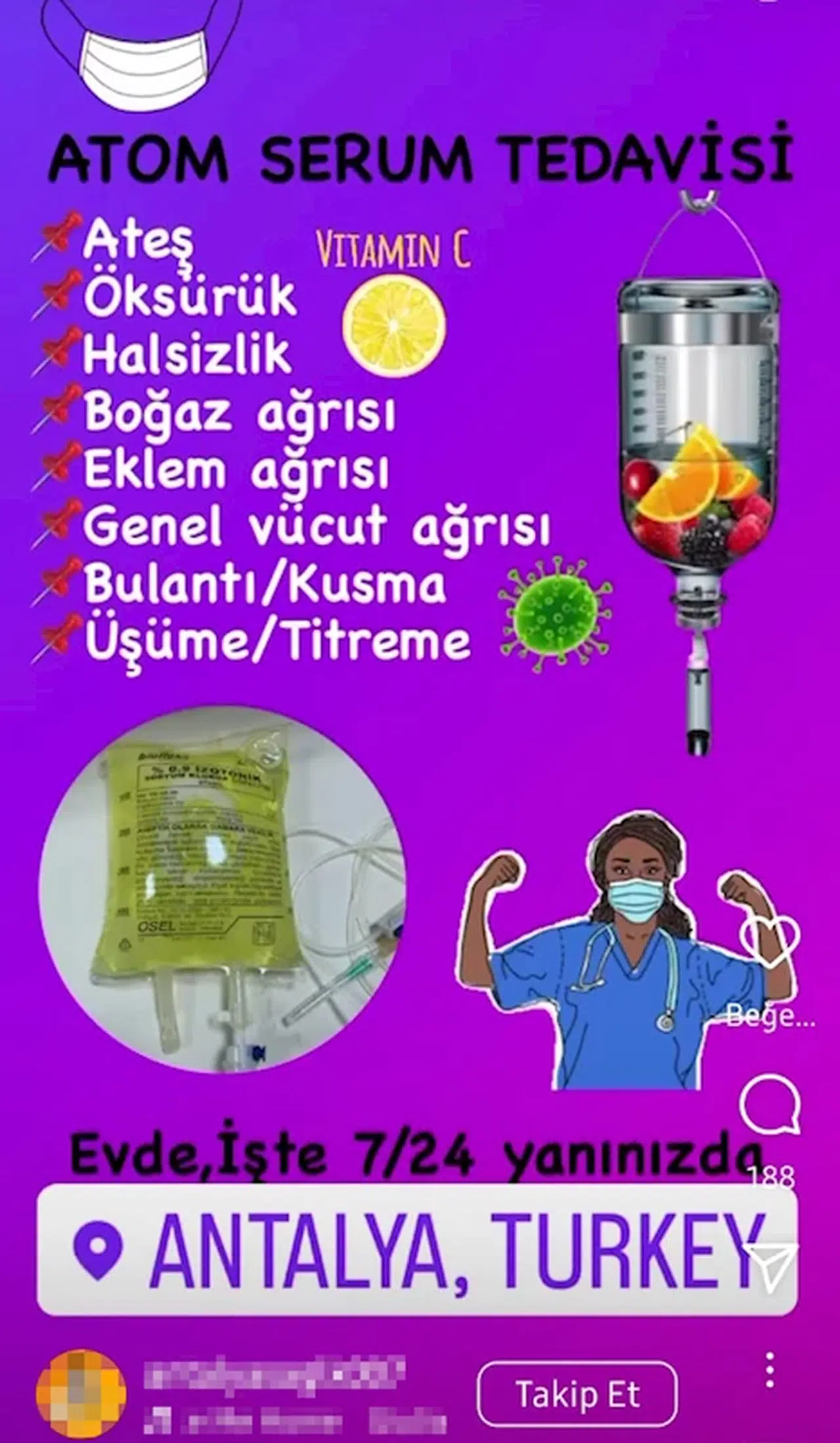 Antalya'da özellikle yabancı tatilcilere uygulanan bu yöntem için sosyal medyada hesap oluşturulduğu görüldü. Sosyal medyada verilen ilanda 'Evde, işte 7/24 yanınızda' ibaresi dikkati çekerken ayrıca ateş, öksürük, halsizlik, boğaz ağrısı, eklem ağrısı, genel vücut ağrısı, bulantı ve kusma, üşüme ve titreme gibi şikayetlere de iyi geleceği belirtiliyor. Sosyal medyadaki hesabı 10 bin kişinin takip ettiği dikkati çekerken, bir başka ilanda evde uzman doktor muayenesinin ve hemşire desteğinin yanı sıra, laboratuvar desteği verileceğinin yazılı olduğu da görüldü.