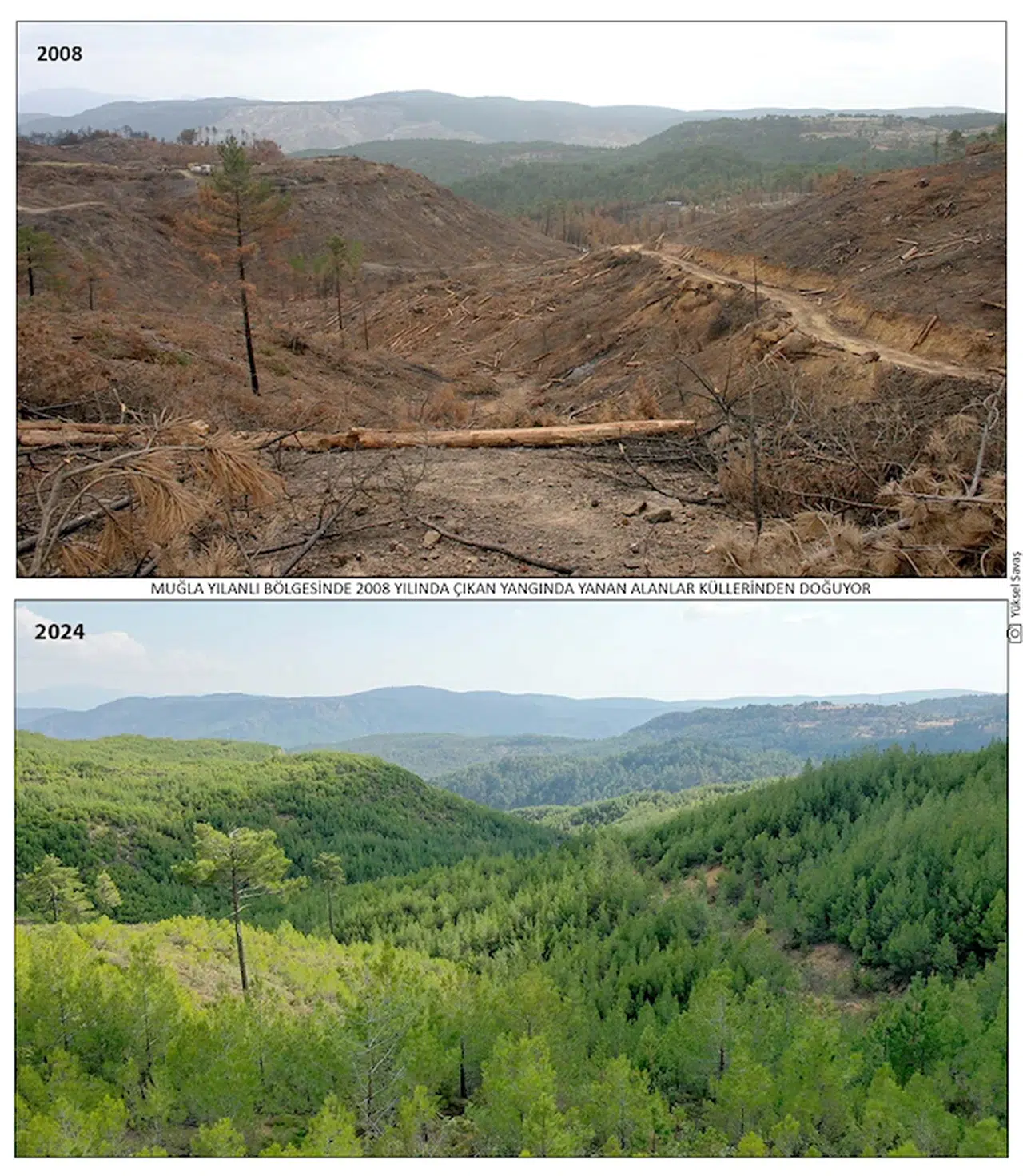 Muğla Orman Bölge Müdürlüğü 2008'deki alanın zarar görmüş hali ile 2024 yılında yeşile döndüğü fotoğrafları sosyal medya hesabından paylaştı. (DHA)