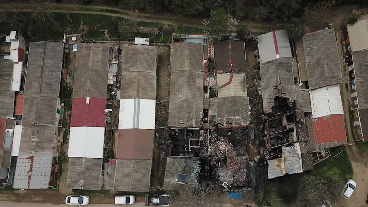 Yiğithan HÜYÜK/MUDANYA (Bursa), (DHA)- BURSA'nın Mudanya ilçesinde dün akşam çoğu ahşap 18 evin kullanılamaz hale geldiği yangın sonrası mahalle, dron ile görüntülendi.