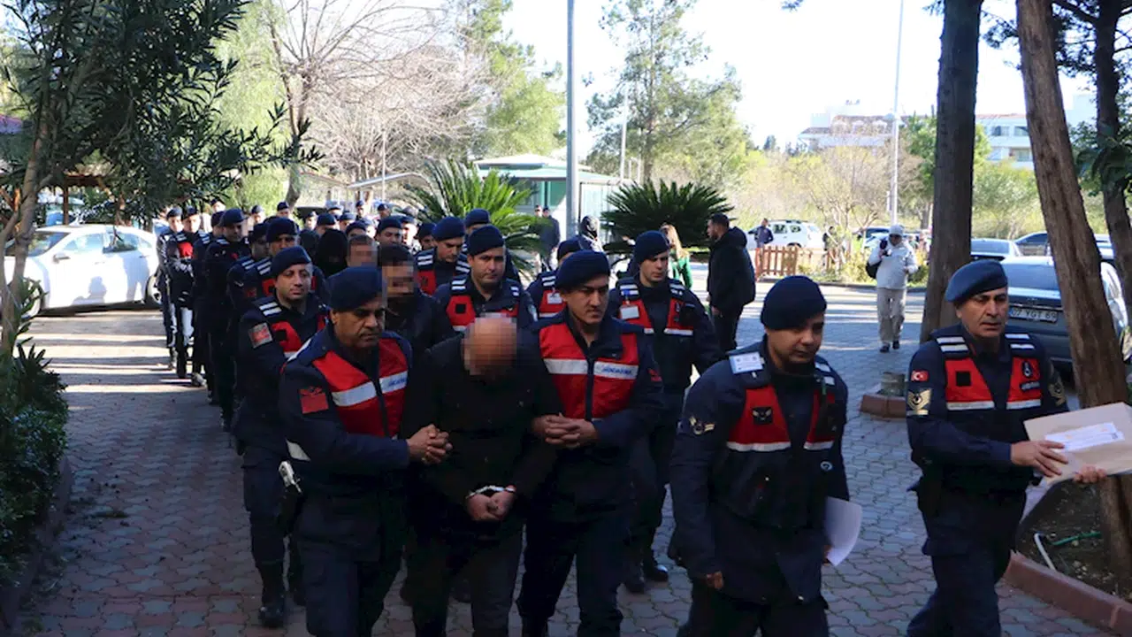 Jandarma Genel Komutanlığı İstihbarat Daire Başkanlığı ve KOM Daire Başkanlığı ekiplerinin de katılımıyla suç örgütüne yönelik geçen pazar günü operasyon düzenlendi. Gözaltına alınan K.A., A.K. ve D.C. ile 2'si kadın 14 şüpheli, işlemlerinin ardından bugün Kemer Adliyesi'ne sevk edildi. (DHA)