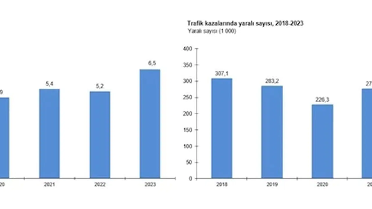 Türkiye'de 2023 yılında bir önceki yıla göre trafikteki motorlu kara taşıtı sayısı yüzde 8,5 artarken, toplam kaza sayısı yüzde 6,6, ölümlü yaralanmalı kaza sayısı yüzde 19,2, maddi hasarlı kaza sayısı yüzde 4,2, toplam ölü sayısı yüzde 25,2 ve yaralı sayısı yüzde 21,5 arttı.