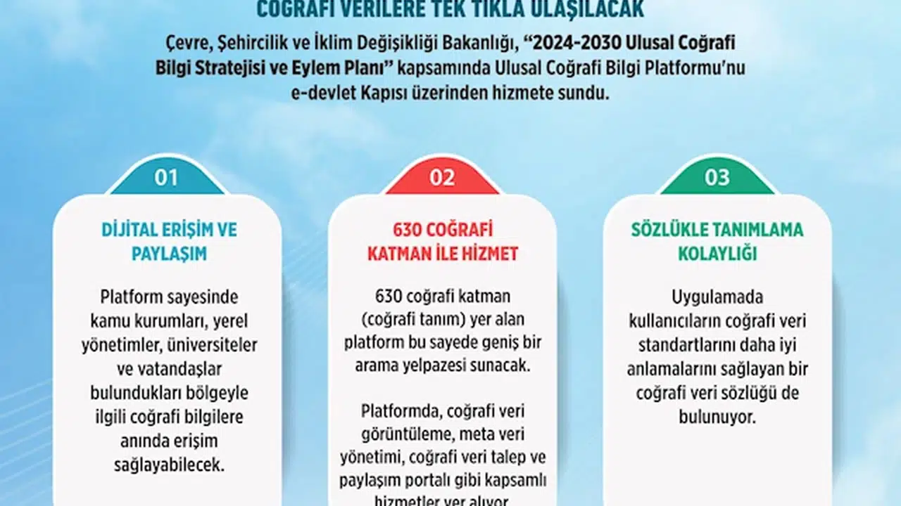 Eylem planının ilk adımı olarak Ulusal Coğrafi Bilgi Platformu, e-Devlet Kapısı üzerinden ortak kullanıma açıldı. Platform sayesinde, vatandaşların bulundukları bölgeyle ilgili coğrafi bilgilere anında erişimi sağlanacak. Uygulama, kamu kurumları, yerel yönetimler, üniversiteler ve vatandaşların erişimine açık olacak. Coğrafi verilerin güvenilir ve hızlı paylaşımıyla kamu hizmetlerinin etkinliği artırılacak.