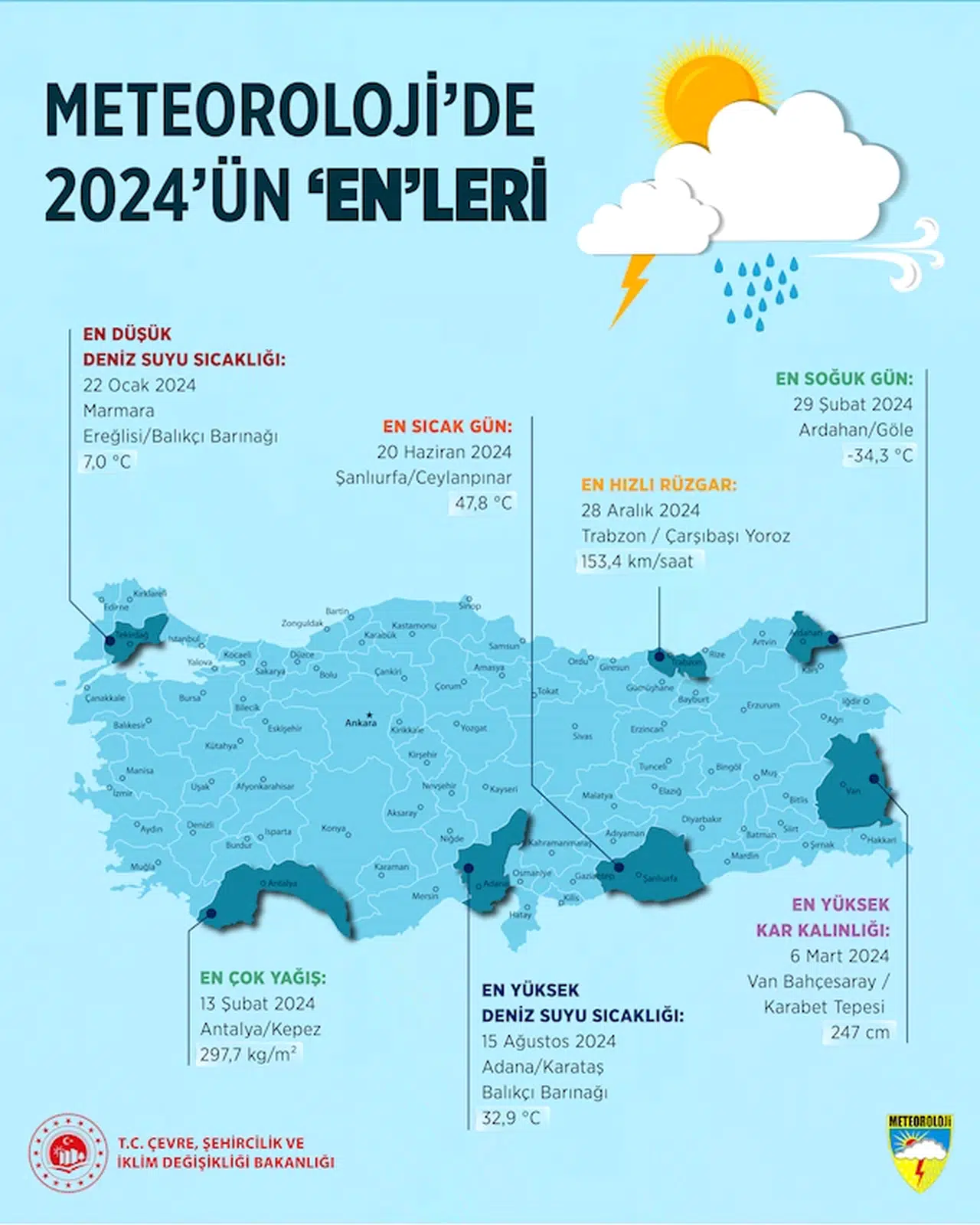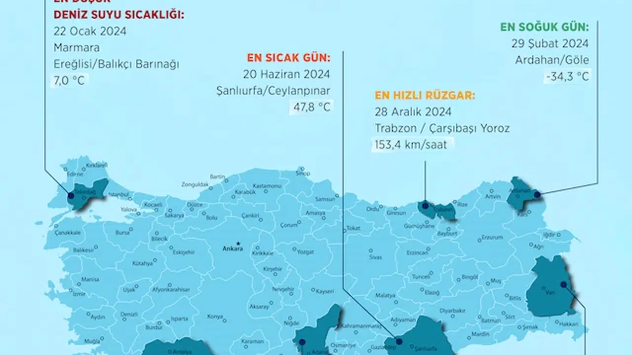 Rüzgarın en hızlı estiği gün, Trabzon'da Çarşıbaşı Yoroz'da saatte 153,4 kilometre hızla 28 Aralık oldu. İl merkezlerinde en yüksek rüzgar ölçümü, 24 Kasım'da Konya'da 88,9 kilometre saat hız olarak kayıtlara geçti. 2024 yılında deniz suyu sıcaklıklarında ölçülen en yüksek sıcaklık, 15 Ağustos'ta Adana'nın Karataş Balıkçı Barınağı Ana Mendirek Feneri İstasyonu'nda 32,9 derece olarak kayıtlara geçti. En düşük deniz suyu sıcaklığı, 22 Ocak'ta Marmara Ereğlisi Balıkçı Barınağı Mendirek Feneri İstasyonu'nda 7 derece ile ölçüldü. (DHA)
