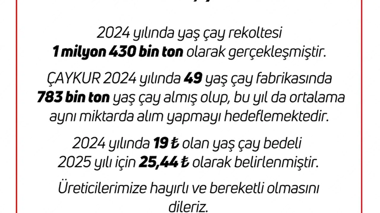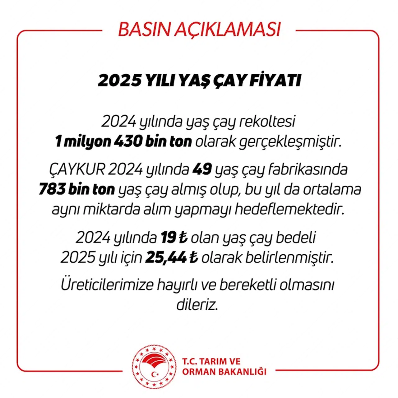 Bakanlıktan yapılan yazılı açıklamada, "2024 yılında yaş çay rekoltesi 1 milyon 430 bin ton olarak gerçekleşmiştir. ÇAYKUR 2024 yılında 49 yaş çay fabrikasında 783 bin ton yaş çay almış olup, bu yıl da ortalama aynı miktarda alım yapmayı hedeflemektedir. 2024 yılında 19 TL olan yaş çay bedeli 2025 yılı için 25,44 TL olarak belirlenmiştir. Üreticilerimize hayırlı ve bereketli olmasını dileriz" denildi. (DHA)
