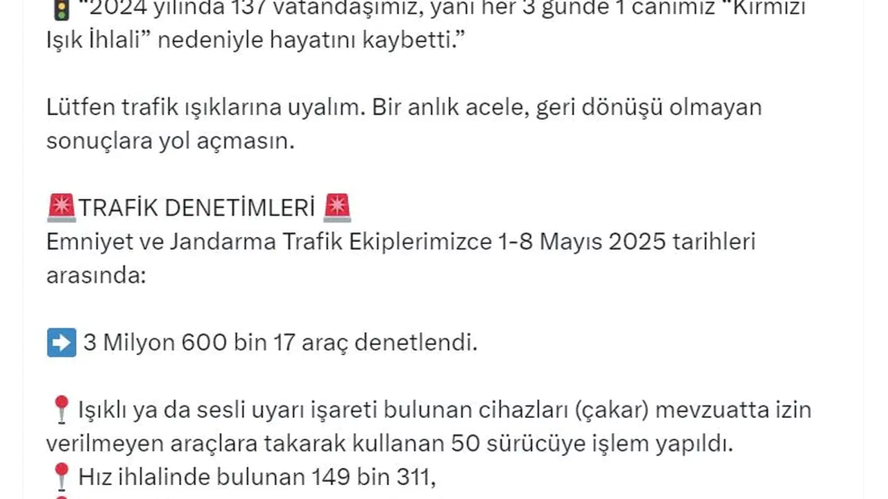 Paylaşımında ayrıca trafik denetim verilerine yer veren Bakan Yerlikaya, "Emniyet ve jandarma trafik ekiplerimizce 1-8 Mayıs 2025 tarihleri arasında 3 milyon 600 bin 17 araç denetlendi. Işıklı ya da sesli uyarı işareti bulunan cihazları (çakar) mevzuatta izin verilmeyen araçlara takarak kullanan 50 sürücüye işlem yapıldı. Hız ihlalinde bulunan 149 bin 311, periyodik muayenesi yaptırılmamış 27 bin 818, emniyet kemeri kullanmayan 25 bin 993, sürücü belgesiz araç kullanan 16 bin 677 ve zorunlu mali sorumluluk sigortası bulunmayan 7 bin 474 olmak üzere diğer işlemlerle birlikte toplam 498 bin 666 araca/sürücüye işlem yapıldı. Yolculuklar sizleri sevdiklerinize kavuşturmak için vardır, ayırmak için değil" ifadelerini kullandı. (DHA)