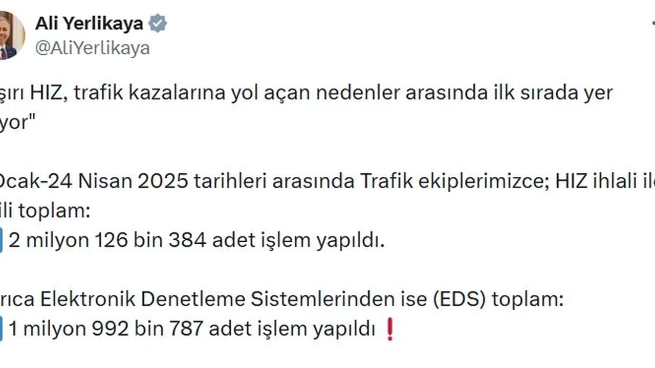Bakan Yerlikaya, sosyal medya hesabından yaptığı açıklamada, 1 Ocak-24 Nisan tarihleri arasında trafik ekiplerince; hız ihlali ile ilgili toplam 2 milyon 126 bin 384 işlem yapıldığını, Elektronik Denetleme Sistemlerinden (EDS) ise toplam 1 milyon 992 bin 787 işlem gerçekleştirildiğini belirtti. Yerlikaya, "Araç kullanırken hız sınırlarını aşmak, sadece birkaç dakika erken varmak için hem kendi hayatınızı hem de başkalarının hayatını tehlikeye atmak demektir; unutmayalım, hız kazandırmaz, hayatımızdan çalar" ifadelerini kullandı.