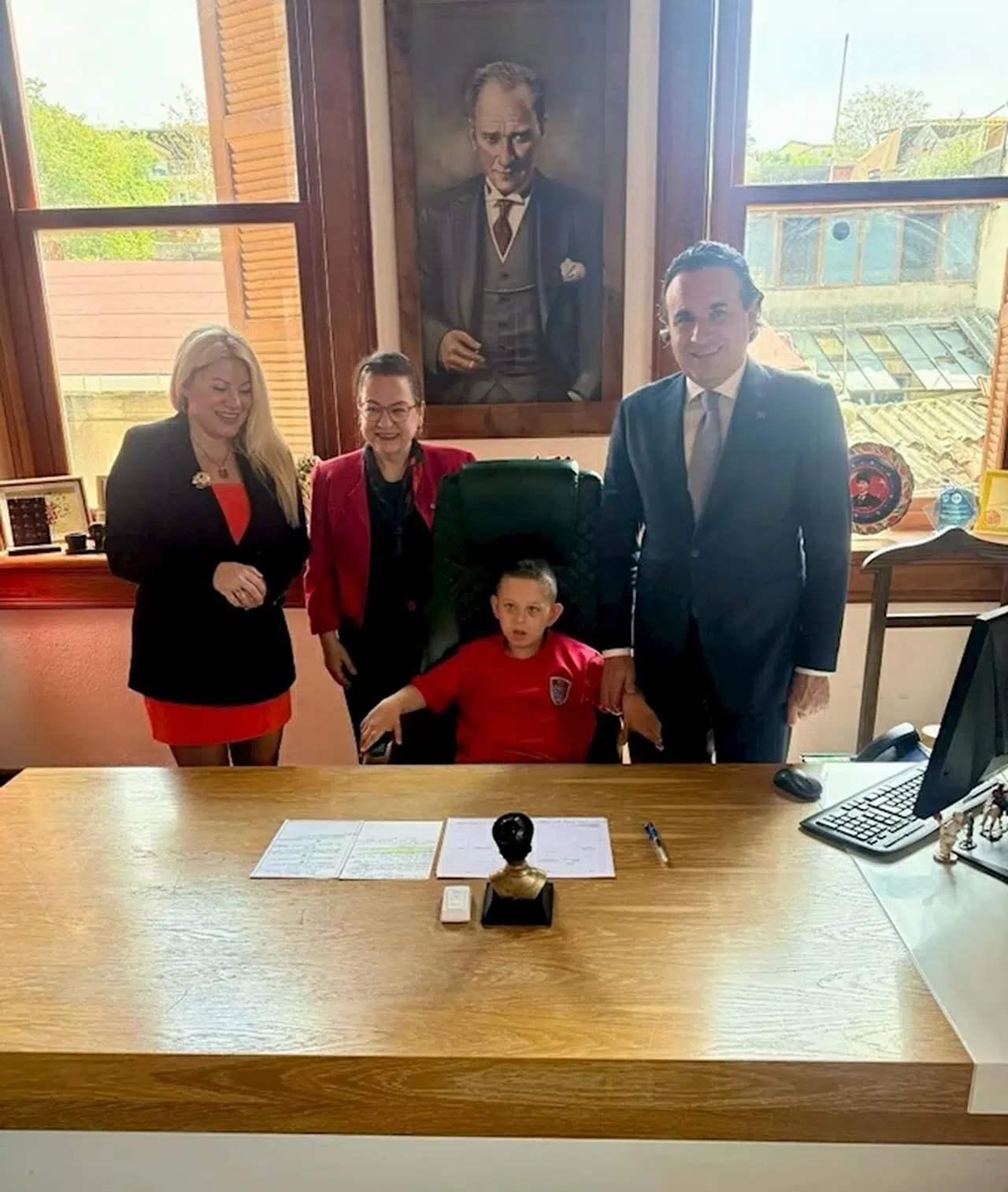 Nevra UÇKAÇ / İZMİR, (DHA)-İZMİR Konak Kaymakamı Gökhan Görgülüaslan, 23 Nisan Ulusal Egemenlik ve Çocuk Bayramı dolayısıyla başkanlık koltuğunu özel öğrenciler Salihcan Özganim (9) ve Arel Erdoğan'a (11) devretti.