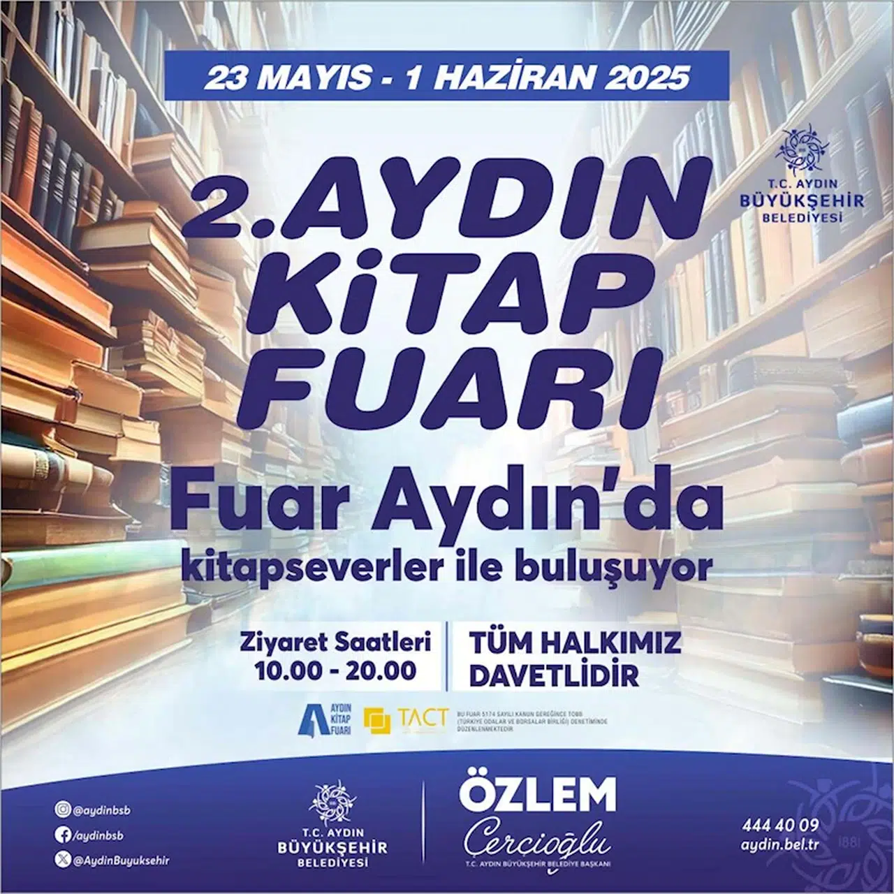 2'nci Aydın Kitap Fuarı, kapılarını açmaya hazırlanıyor. 23 Mayıs-1 Haziran tarihleri arasında Fuar Aydın'da düzenlenecek fuara ünlü yazarlar ve yayınevleri katılacak, söyleşiler ile imza günleri düzenlenecek. Vatandaşlar, 2. Aydın Kitap Fuarı'nı her gün 10.00 ile 20.00 saatleri arasında ziyaret edebilecek. Büyükşehir Belediyesi tarafından Aydın Tekstil Parkı içerisinde açılışı gerçekleştirilen Fuar Aydın'da düzenlenecek 2. Aydın Kitap Fuarı'na tüm vatandaşları davet eden Aydın Büyükşehir Belediye Başkanı Özlem Çerçioğlu, "Fuar Aydın'da bir kez daha Aydın Kitap Fuarı'na ev sahipliği yapacağız. 2'ncisi düzenlenecek olan Aydın Kitap Fuarı'na tüm vatandaşlarımızı davet ediyorum. Unutmamalıyız ki kitaplar, aydınlık yarınlarımıza açılan kapıların anahtarlarıdır" ifadelerini kullandı.(DHA)