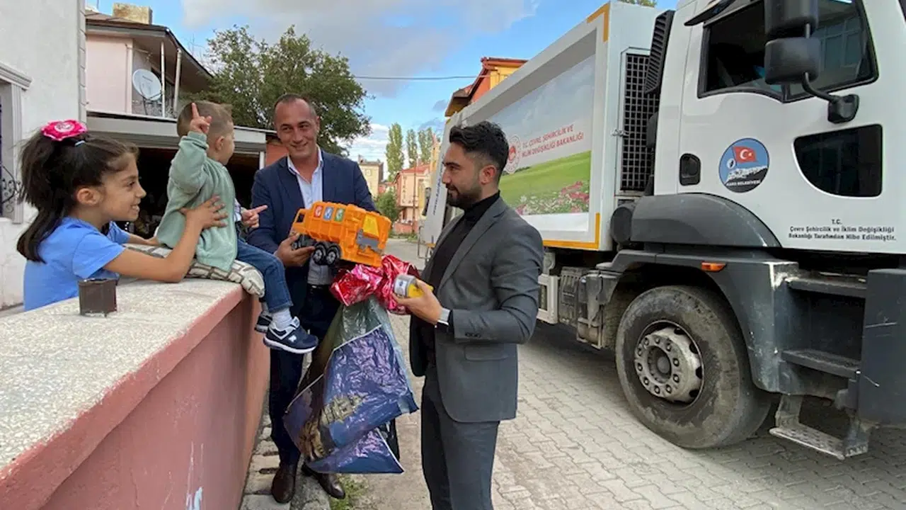 Bedir ALTUNOK/KARS, (DHA)-KARS'ta son 1 yıldır her gün evlerinin bahçe duvarına çıkıp, mahalleye gelen çöp kamyonunu bekleyen Ali Taha Eğer'e (3), Belediye Başkanı Ötüken Senger, oyuncak çöp kamyonu hediye etti. Belediye Temizlik İşleri Müdürü Cihan Nayir'in oyuncağını verdiği Ali Taha, daha sonra belediyenin çöp kamyonu ile şehir turu attı.
