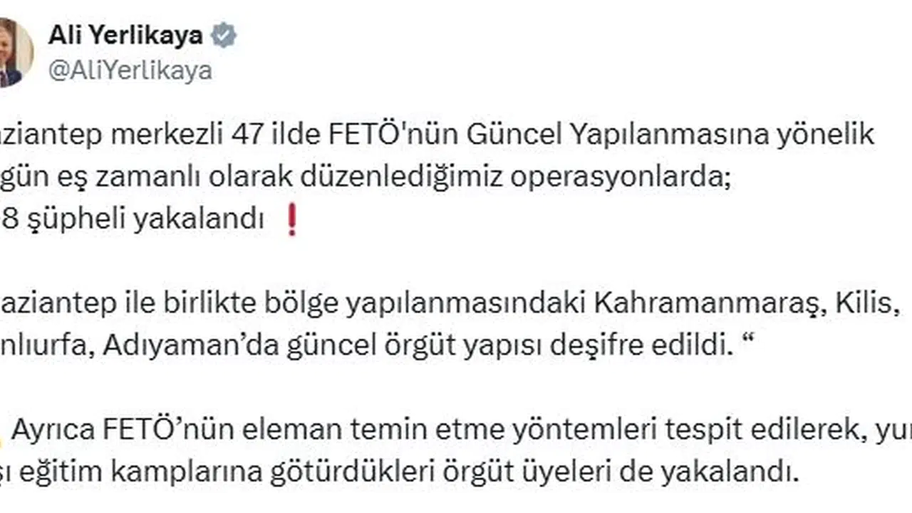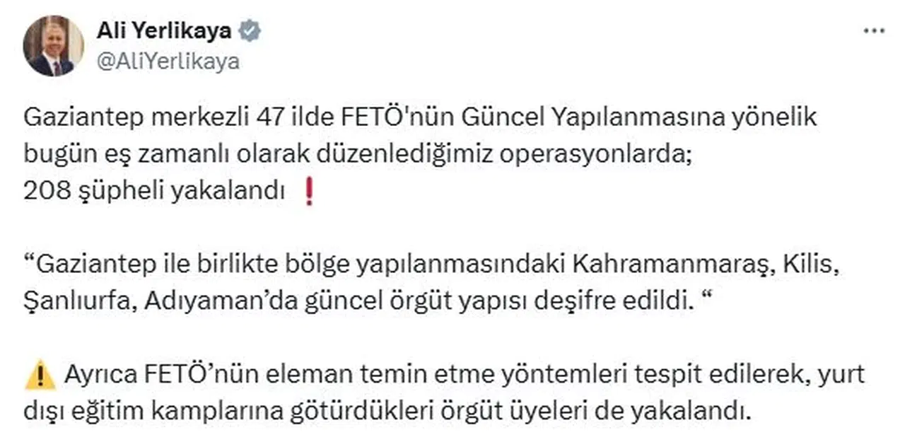 İçişleri Bakanı Ali Yerlikaya'nın sosyal medya hesabından yaptığı açıklamaya göre; Gaziantep Cumhuriyet Başsavcılığı ve Emniyet Genel Müdürlüğü koordinesinde, FETÖ'nün güncel yapılanmasına yönelik 47 ilde eş zamanlı operasyonlar düzenlendi. 208 şüphelinin yakalandığı operasyonda, Gaziantep ile birlikte, bölge yapılanmasındaki Kahramanmaraş, Kilis, Şanlıurfa ve Adıyaman'da güncel örgüt yapısı deşifre edildi. Ayrıca; FETÖ'nün eleman temin etme yöntemleri tespit edilerek, yurt dışı eğitim kamplarına götürdükleri örgüt üyeleri yakalandı.