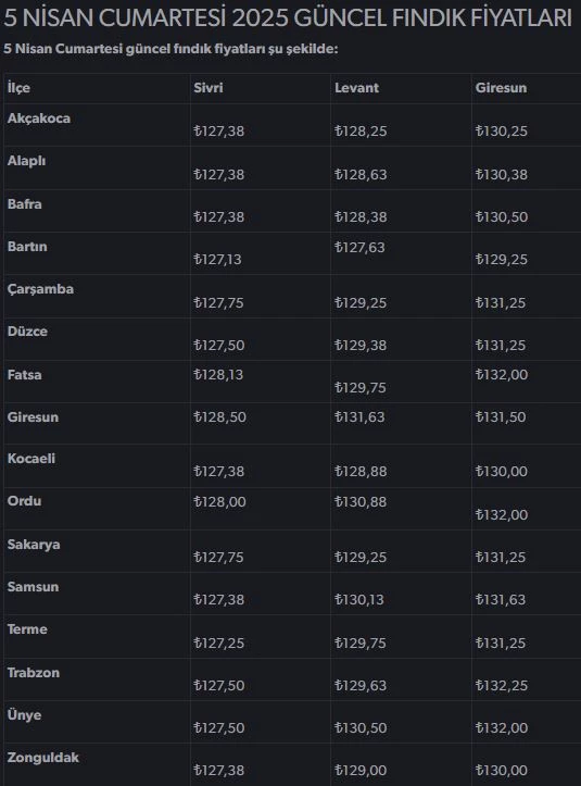 Ordu, Giresun ve Samsun fındık fiyatları ise sırasıyla 117 TL ile 123 TL arasında değişiyor. Karadeniz Bölgesi'ndeki bu fiyatlar, üreticiler için olumlu bir ortam yaratıyor. TMO fiyatları ise Levant kalite fındık için 130 TL, Giresun kalite fındık için ise 132 TL olarak belirlenmiş durumda.