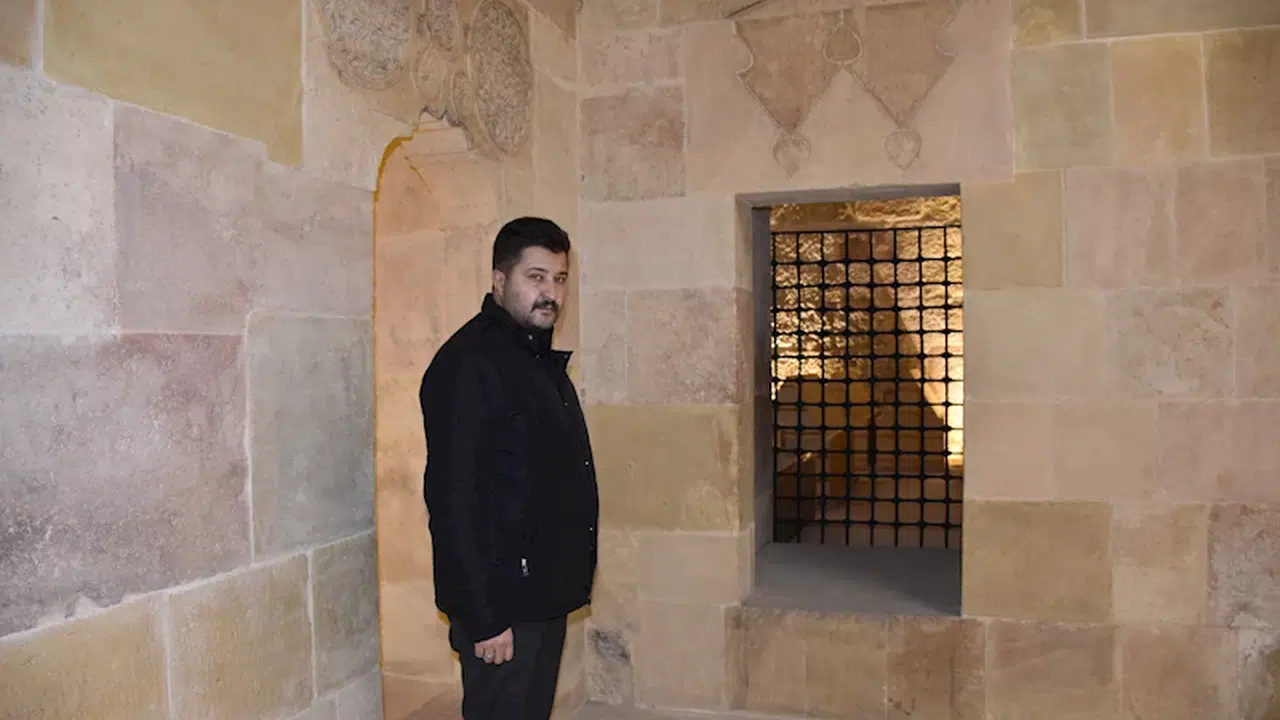 Kabir odası giriş kapısının üzerine sade ama çok şey anlatan bir simge yapıldığını anlatan Ayan, "Burayı kabir odası olarak bırakan Baş Mimar Muğis oğlu Ahlatlı Hürrem Şah, kapı üzerine çok basitmiş gibi gözüken ama maneviyat yüklü bir motif yapmıştır. Bu motifi iki şekilde ele alıyoruz. Üst tarafı tabutun üst kapağıdır. Bunun komplesini bir terazi olarak görünür. Terazinin kefelerinde kalpler tartılmaktadır. Terazilerin orta denge çubuğunda da bir kalp vardır ve o da ters oturtulmuştur, yukarı bakmaktadır. Buradaki tasavvufi mesaj şudur. İçeride yatan merhum ve merhumelerin dili ile 'Biz bu dünyadan göçüp ve gittik. Sizler de göçüp gideceksiniz. Ama bu dünyada yaptıklarımızın karşılığını görebileceğimiz bir yer var. Bu yer ahiret alemi, oraya götüreceğimiz şeyler dünyadaki paramız, malımız, mülkümüz değil, kalplerimiz ve kalplerimizin içerisindekilerdir' anlamı budur. 'İnsan dünyadayken neler yapar? İyilik, kötülük, doğru yanlış, sevap günah gibi hallerde teraziyi bir hal üzerine tutun, kalbiniz her daim Allah'a yönelik olsun. O zaman ölmekten korkmayın, girin kabre' mesajı verilmiştir" diye konuştu. (DHA)