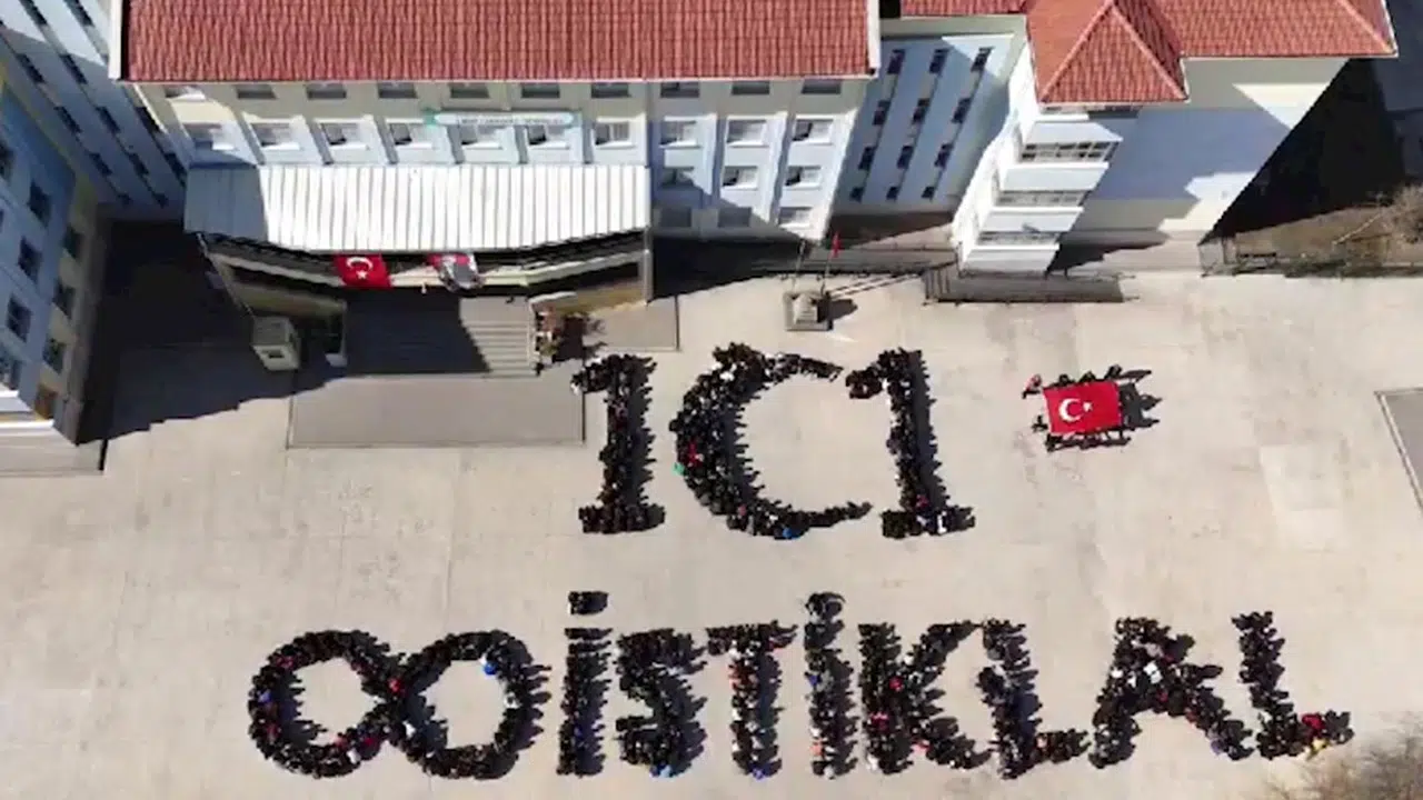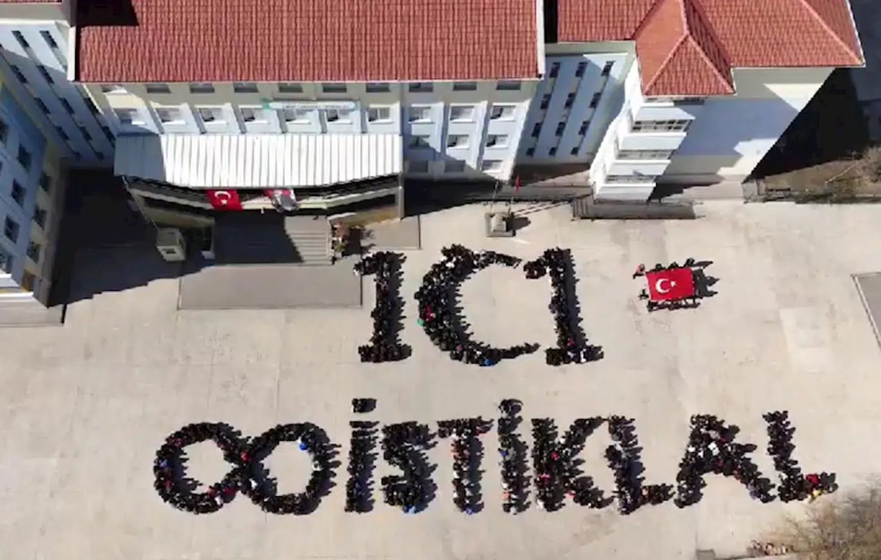 Odunpazarı ilçesine bağlı 71 Evler Mahallesi’ndeki Cahit Zarifoğlu Ortaokulu, İstiklal Marşı'nın kabulünün 104’ncü yıl dönümüne özel özel koreografi hazırladı. Okulun 900 kadar öğrencisi sırayla binadan çıkıp bahçede ‘1 hilal 1 bayrak ilelebet İstiklal’ yazısını tamamlayarak koreografi oluşturdu. Koreografi de İstiklal yazısının yanında sonsuzluk işareti ile Türk bayrağı yer aldı. Öğrencilerin bu etkinliği dron ile görüntülendi. (DHA)