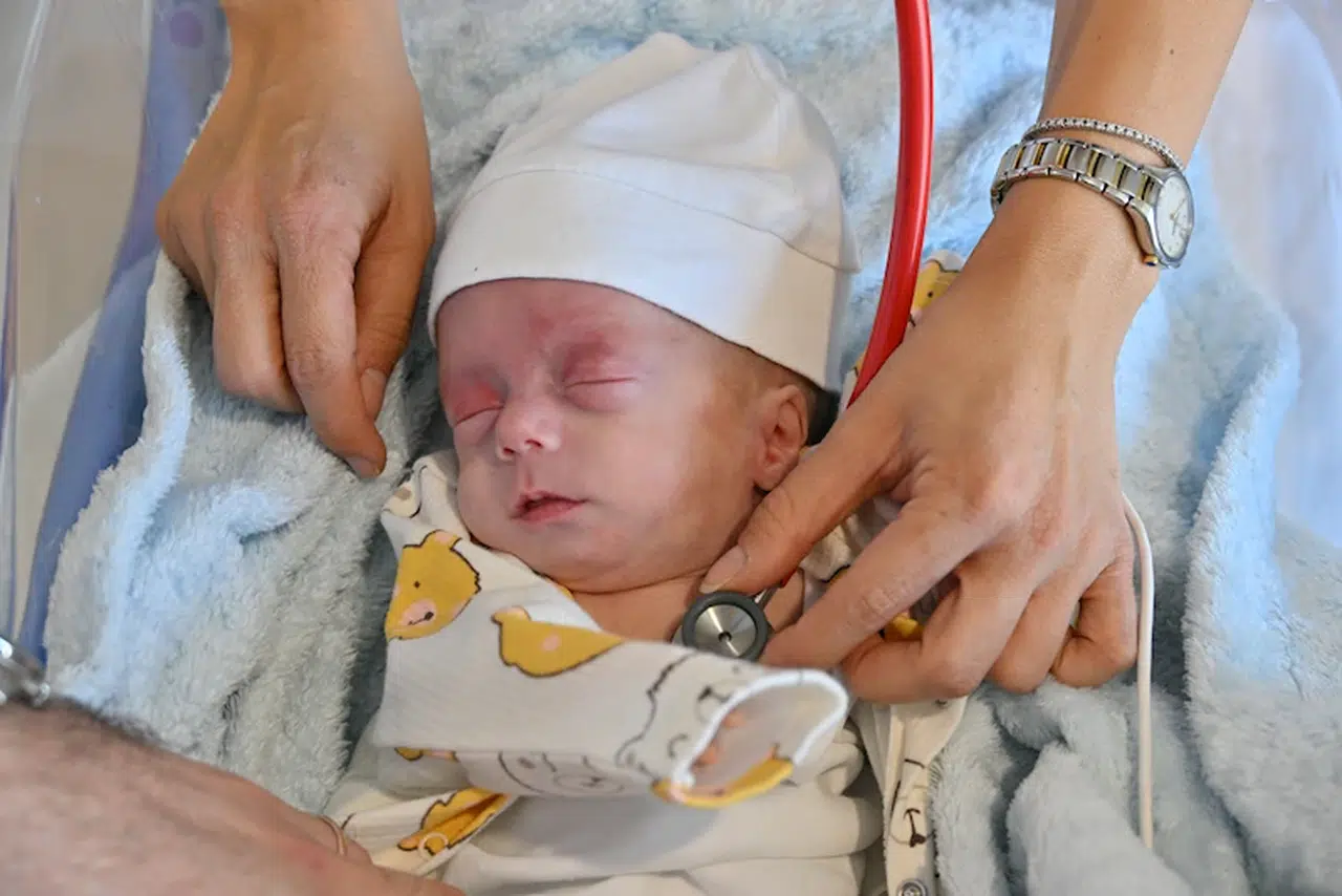 Yenidoğan Bölümü'nden Doç. Dr. Seda Aydoğan, "Işık bebek, 30'uncu gebelik haftasında 980 gram olarak doğmuştu. Hastamız, erken doğum yani prematüre nedeniyle solunum sıkıntısı olması yüzünden yenidoğan yoğun bakım ünitesinde takip ediliyordu. Solunum sıkıntısının devam etmesi, semptomlarının artması nedeniyle doğumundan 13 gün sonra hastamız tekrar muayene edildiğinde hastamızda kalpten çıkan ve vücudu besleyen ana damarda ciddi bir tıkanıklık saptandı. Çocuk kalp merkezi olmamız sebebiyle hastamız bize sevk edildi. Işık bebeğin yaşamının 15'inci gününde çocuk kardiyologlarımız tarafından anjiyo ile bu damarda açılma işlemi yapıldı" dedi.