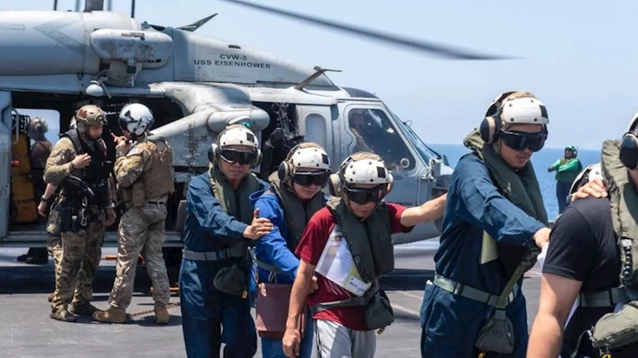 ABD Deniz Kuvvetleri Merkez Komutanlığı’ndan yapılan açıklamada, “Dwight D. Eisenhower’da görevli denizciler, 15 Haziran'da Kızıldeniz'de İran destekli Husiler tarafından saldırıya uğrayan bir ticari geminin mürettebatını havadan taşıdı. Liberya bandıralı, Yunanistan'a ait dökme yük gemisi M/V Tutor, 12 Haziran'da güney Kızıldeniz'in uluslararası sularında seyrederken İran destekli bir Husi insansız deniz aracı tarafından vuruldu. Saldırı geminin makine dairesinde ciddi su baskınına ve hasara yol açtı. Bir sivil denizci halen kayıptır. Helikopter Deniz Taarruz Filosu (HSM) 74'ten bir helikopter, Tutor'dan 24 sivil denizciyi havayoluyla Ticonderoga sınıfı güdümlü füze kruvazörü USS Philippine Sea'ye taşıdı. Oradan da Helikopter Deniz Savaş Filosu (HSC) 7'nin helikopterleri, grubu USS Dwight D. Eisenhower'a taşıdı. Denizciler uçak gemisinde tıbbi kontrolden geçirildikten sonra daha sonraki bakım için karaya götürüldü” denildi.
