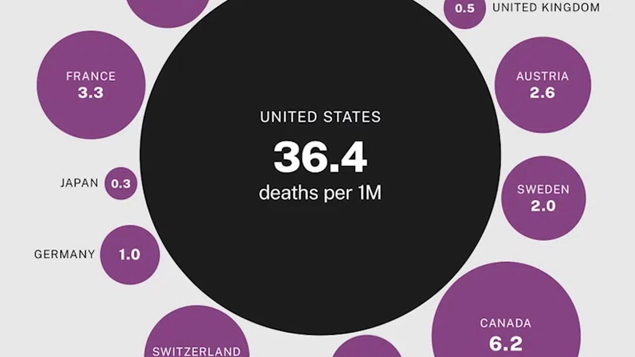 ABD’nin çocuklar arasında silahla ölüm oranı diğer gelişmiş ülkelere göre kıyaslandığında açık ara önde olduğu ayrıca ortaya kondu, buna göre ABD’deki oran Kanada’ya kıyasla 5 kat, İsveç’e kıyasla 18 kat ve Avustralya’ya kıyasla 22 kat daha fazla. 2019 verilerine göre, 1-19 yaş aralığında ABD’de silahla ölümlerin bir milyon kişide 36.4 ölüm olduğu ancak buna karşın Kanada’da milyonda 6.2 ölüm, İsviçre’de 3.1 ölüm, İsveç’te 2.0 ölüm, Fransa’da 3.3 ölüm ve Avustralya’da 1.6 ölüm olduğu kaydedildi.
