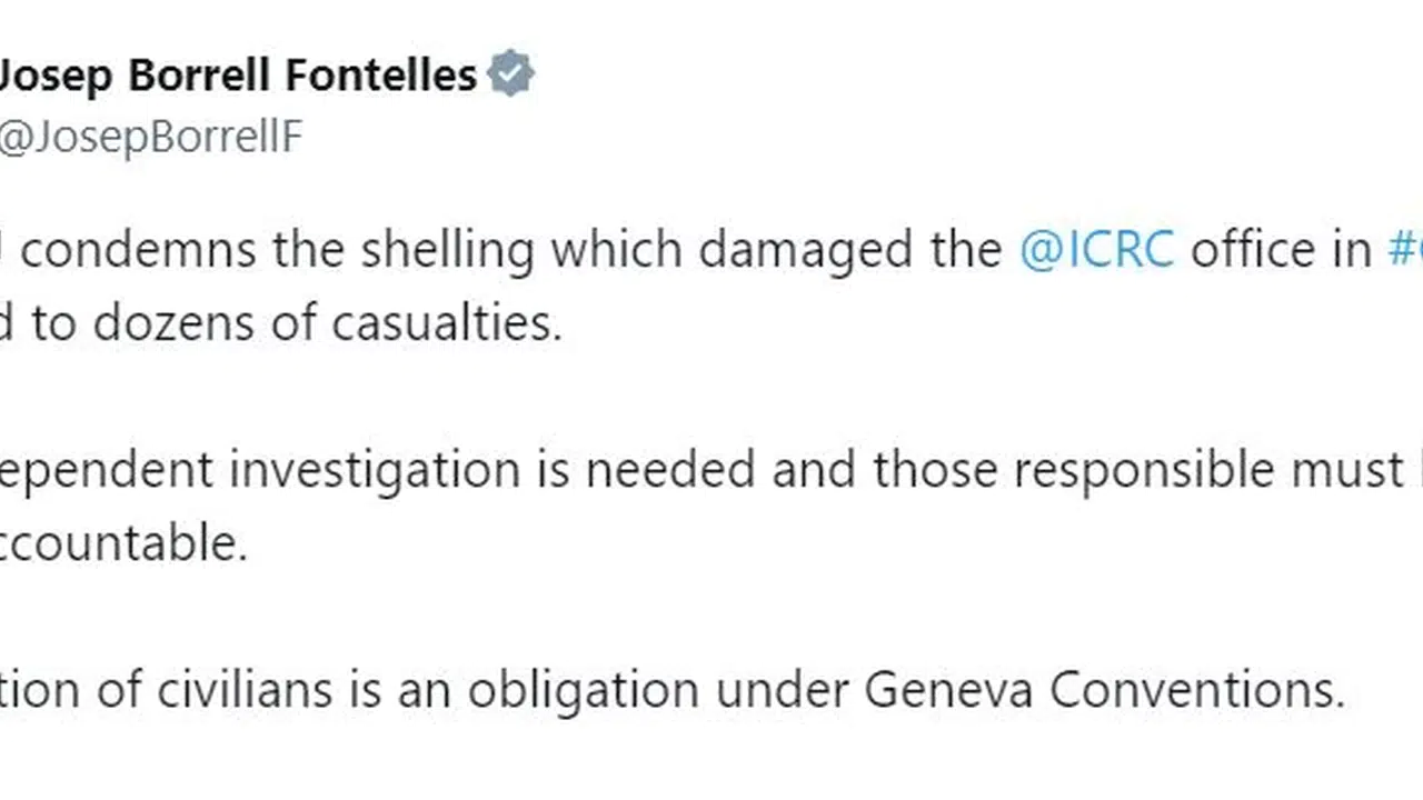 Avrupa Birliği Dışişleri ve Güvenlik Politikaları Yüksek Temsilcisi ve Avrupa Konseyi Başkan Yardımcısı Borrell, dün yaptığı açıklamada, “AB, Gazze'deki ICRC ofisine zarar veren ve onlarca can kaybına yol açan bombardımanı kınamaktadır. Bağımsız bir soruşturmaya ihtiyaç vardır ve sorumlular hesap vermelidir. Sivillerin korunması Cenevre Sözleşmeleri kapsamında bir yükümlülüktür. Çatışma halindeki tüm taraflar buna bağlıdır. ICRC, insani koruma, mağdurlara yardım ve mahkumlara erişim de dahil olmak üzere Cenevre Sözleşmelerindeki tüm görevlerini güven içinde yerine getirebilmelidir” dedi.