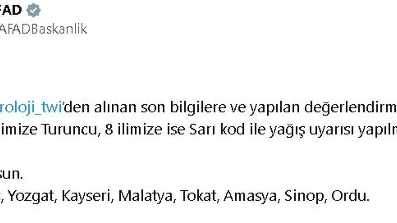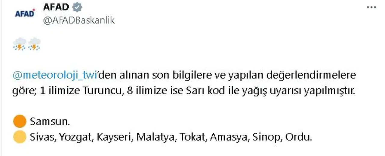 Gizem ÇORLU/ANKARA, (DHA)- İÇİŞLERİ Bakanlığı Afet ve Acil Durum Yönetimi Başkanlığı (AFAD), Meteoroloji Genel Müdürlüğü'nün Samsun'da turuncu, Sivas, Yozgat, Kayseri, Malatya, Tokat, Amasya, Sinop ve Ordu'da sarı kodlu yağış uyarısı yaptığını belirterek, tüm kurumların teyakkuz halinde gelişmeleri takip ettiğini açıkladı.