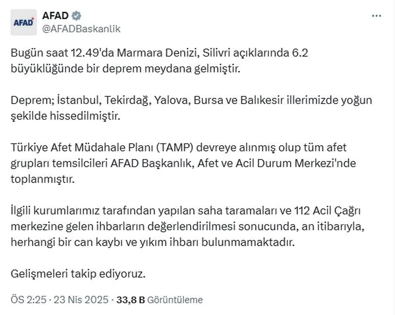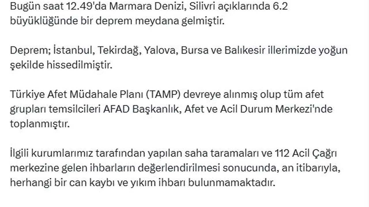 AFAD'tan yapılan yazılı açıklamada, "Bugün saat 12.49'da Marmara Denizi Silivri açıklarında 6.2 büyüklüğünde bir deprem meydana gelmiştir. Deprem; İstanbul, Tekirdağ, Yalova, Bursa ve Balıkesir illerimizde yoğun şekilde hissedilmiştir. Türkiye Afet Müdahale Planı (TAMP) devreye alınmış olup tüm afet grupları temsilcileri AFAD Başkanlık, Afet ve Acil Durum Merkezi'nde toplanmıştır. İlgili kurumlarımız tarafından yapılan saha taramaları ve 112 Acil Çağrı Merkezi'ne gelen ihbarların değerlendirilmesi sonucunda, an itibarıyla herhangi bir can kaybı ve yıkım ihbarı bulunmamaktadır. Gelişmeleri takip ediyoruz" denildi. (DHA)