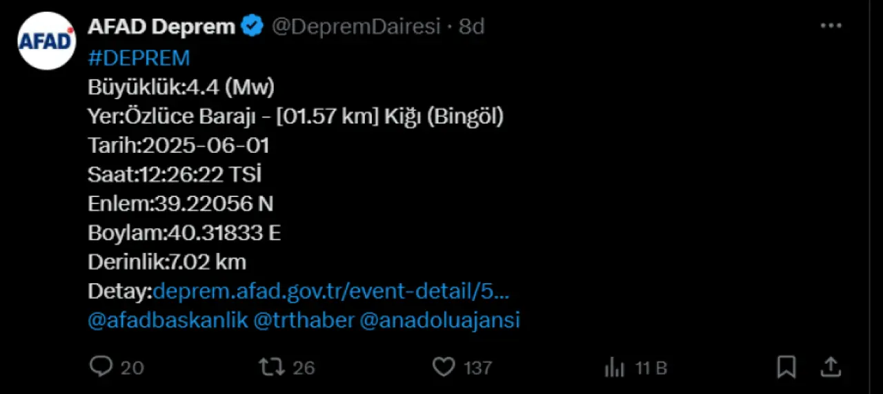 AFAD'dan edinilen bilgilere göre, Bingöl Özlüce Barajı açıklarında 4.4 büyüklüğünde deprem meydana geldi.