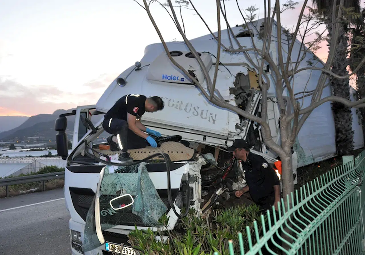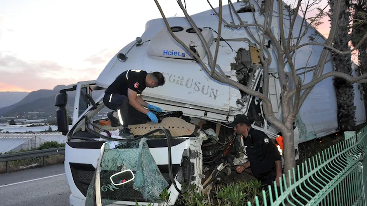 Kaza, saat 05.30 sıralarında Ekmel Mahallesi D-400 kara yolunda meydana geldi. Mersin'den Antalya'ya sebze taşıyan Kamil Eşmen idaresindeki TIR, sürücüsünün direksiyon hakimiyetini kaybetmesiyle refüjdeki ağaçlara çarptı. Yaklaşık 60 metre refüjde ilerleyip duran TIR'da Kamil Eşmen, sıkıştı. İtfaiye ekibi tarafından TIR'dan çıkarılan Eşmen'e sağlık ekibi olay yerinde ilk müdahaleyi yaptı. Eşmen, Gazipaşa Devlet Hastanesi'ne götürüldü. (DHA)