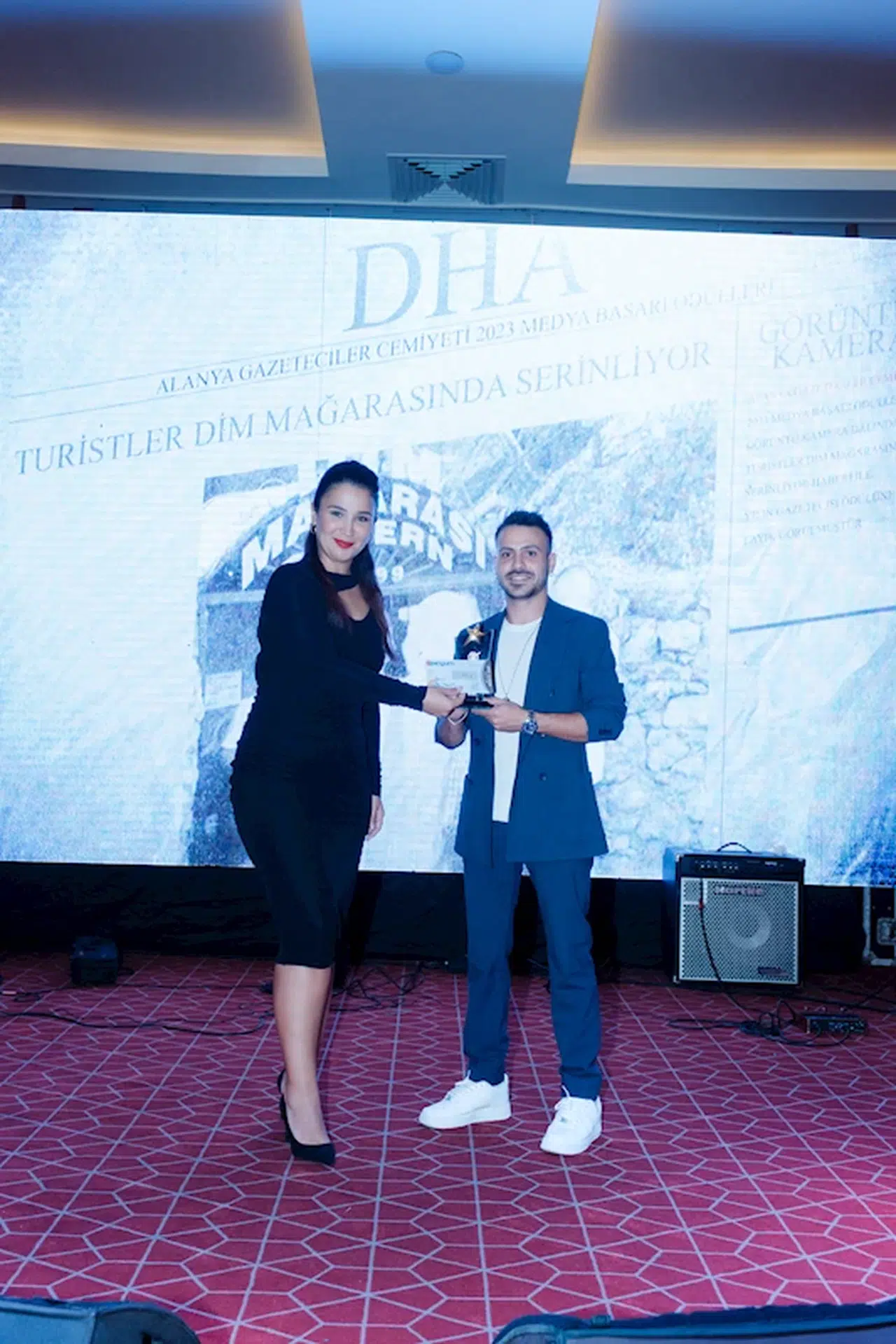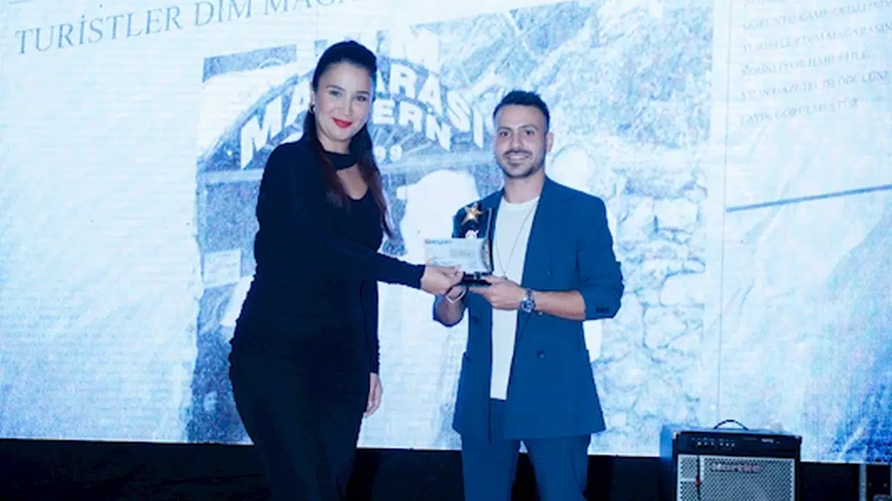 AGC tarafından düzenlenen 2023 Yılı Medya Başarı Ödülleri'nin dağıtıldığı tören ilçedeki bir otelde düzenlendi. Yerel ve ulusal basından çok sayıda gazetecinin katılımıyla gerçekleştirilen törende "Turistler Dim Mağarası'nda Serinliyor" haberiyle 'görüntü-kamera' kategorisinde yılın haberi ödülüne layık görülen Demirören Haber Ajansı (DHA) Alanya muhabiri Alkın Biricik ödülünü aldı. Alkın Biricik'e ödülünü sunucu Ezgi Gözeger verdi. (DHA)