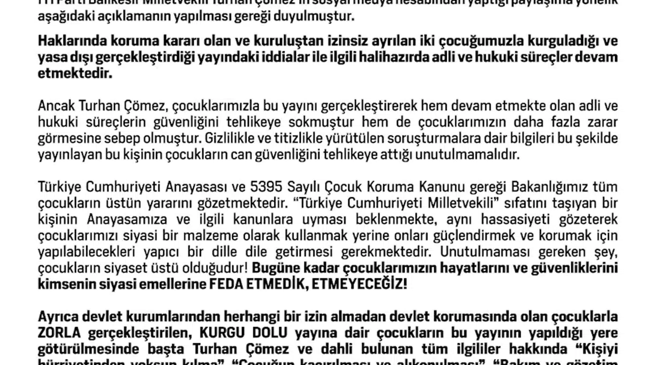 'Türkiye Cumhuriyeti Milletvekili' sıfatını taşıyan bir kişinin Anayasamıza ve ilgili kanunlara uyması beklenmekte. Aynı hassasiyeti gözeterek çocuklarımızı siyasi bir malzeme olarak kullanmak yerine onları güçlendirmek ve korumak için yapılabilecekleri yapıcı bir dille dile getirmesi gerekmektedir. Unutulmaması gereken şey, çocukların siyaset üstü olduğudur! Bugüne kadar çocuklarımızın hayatlarını ve güvenliklerini kimsenin siyasi emellerine feda etmedik, etmeyeceğiz! Ayrıca devlet kurumlarından herhangi bir izin almadan devlet korumasında olan çocuklarla zorla gerçekleştirilen, kurgu dolu yayına dair çocukların bu yayının yapıldığı yere götürülmesinde başta Turhan Çömez ve dahli bulunan tüm ilgililer hakkında 'Kişiyi hürriyetinden yoksun kılma', 'Çocuğun kaçırılması ve alıkonulması', 'Bakım ve gözetim altındaki kişinin rıza dışı kaçırılması' ve 'Özel hayatın gizliliğini ihlal' suçlarından suç duyurusunda bulunuyoruz." (DHA)