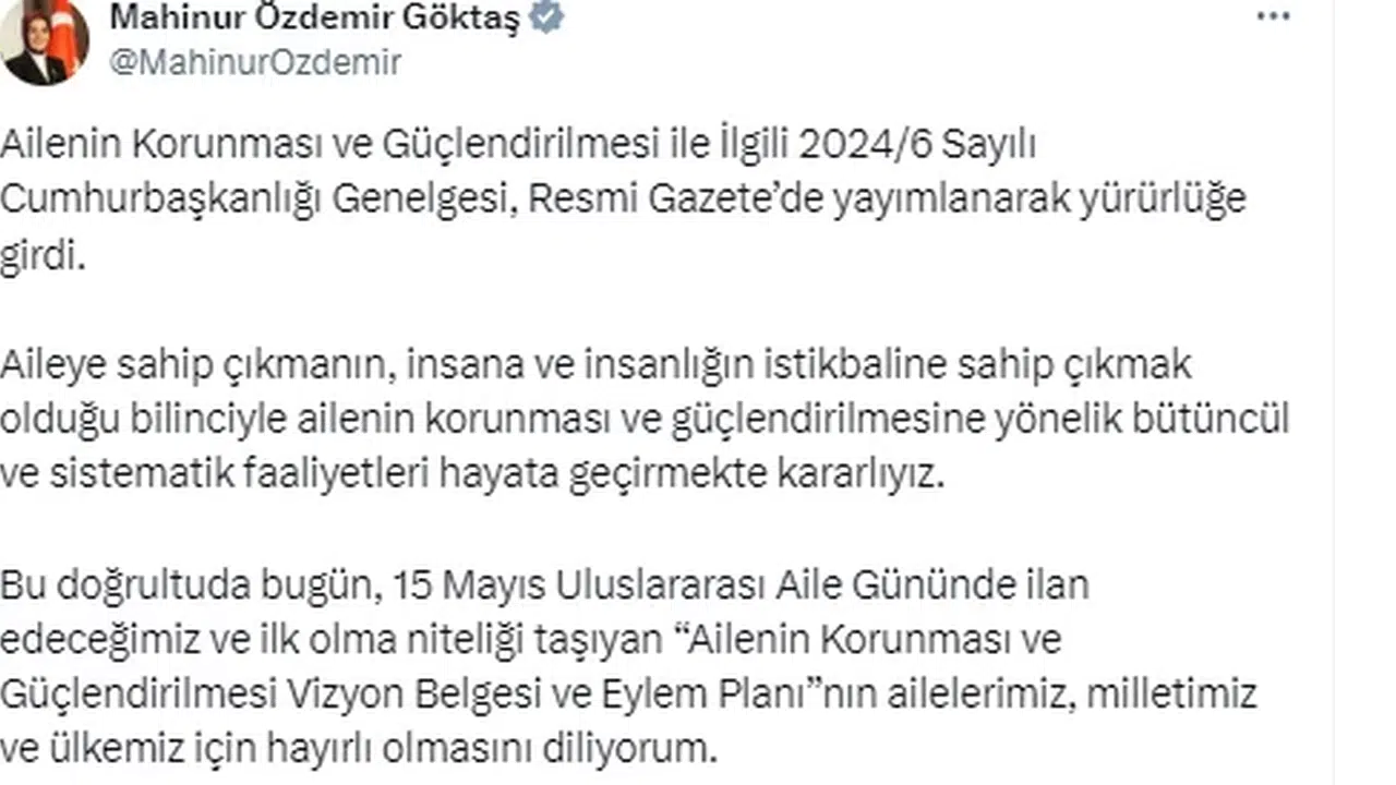 Aliekber METE/ANKARA, (DHA) - AİLE ve Sosyal Hizmetler Bakanı Mahinur Özdemir Göktaş, ailenin korunması ve güçlendirilmesi ile ilgili Cumhurbaşkanlığı Genelgesi'nin, Resmi Gazete'de yayımlanarak yürürlüğe girdiğini duyurdu.