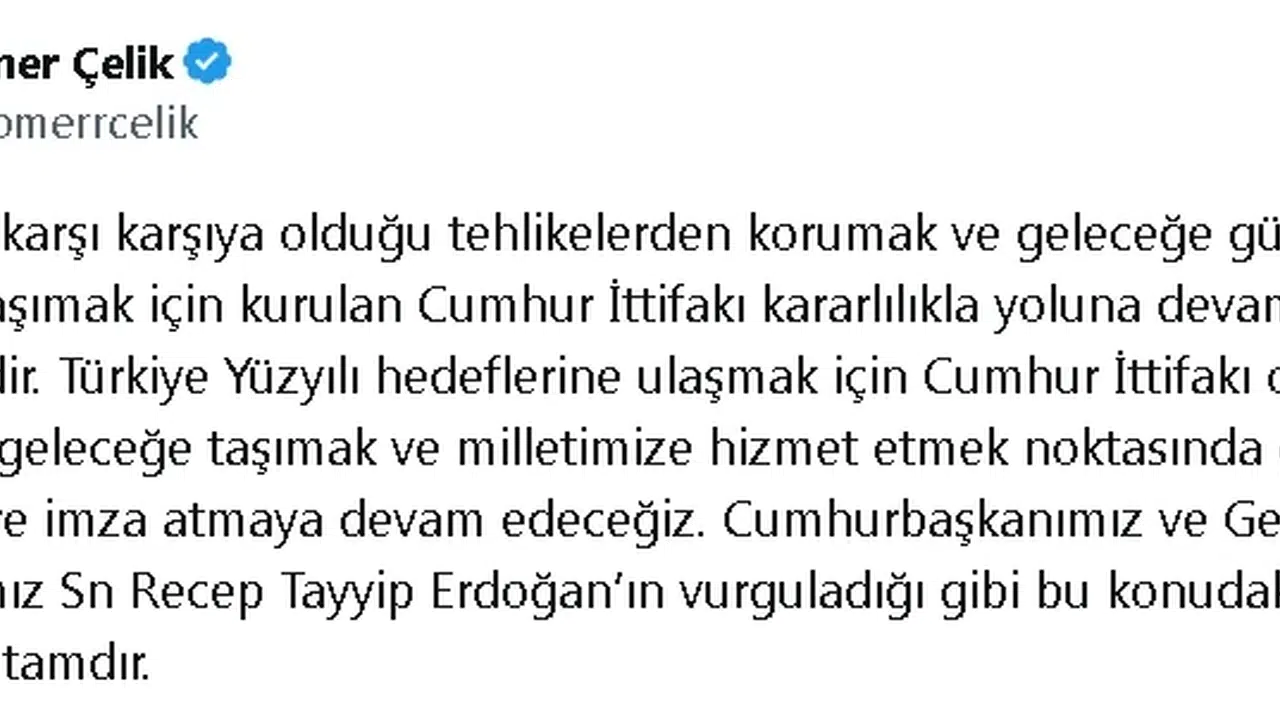 ANKARA, (DHA)- AK Parti Sözcüsü Ömer Çelik, "Ülkemizi karşı karşıya olduğu tehlikelerden korumak ve geleceğe güçlü bir şekilde taşımak için kurulan Cumhur İttifakı kararlılıkla yoluna devam etmektedir" dedi.
