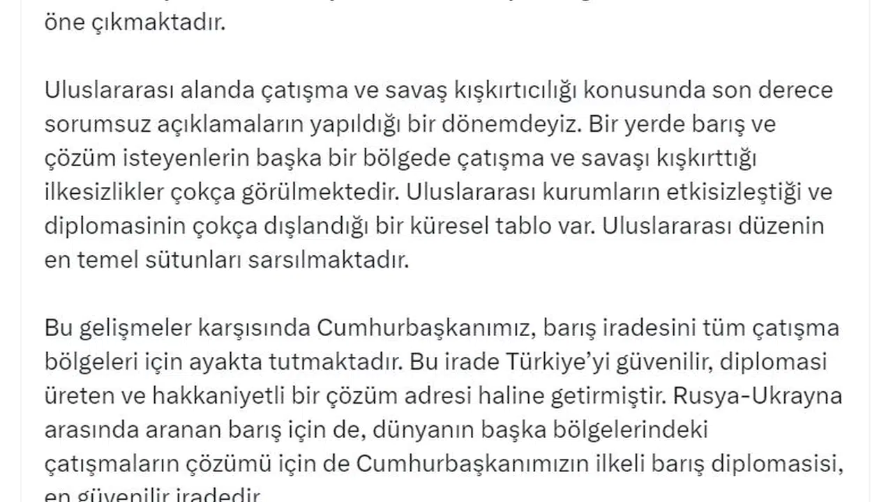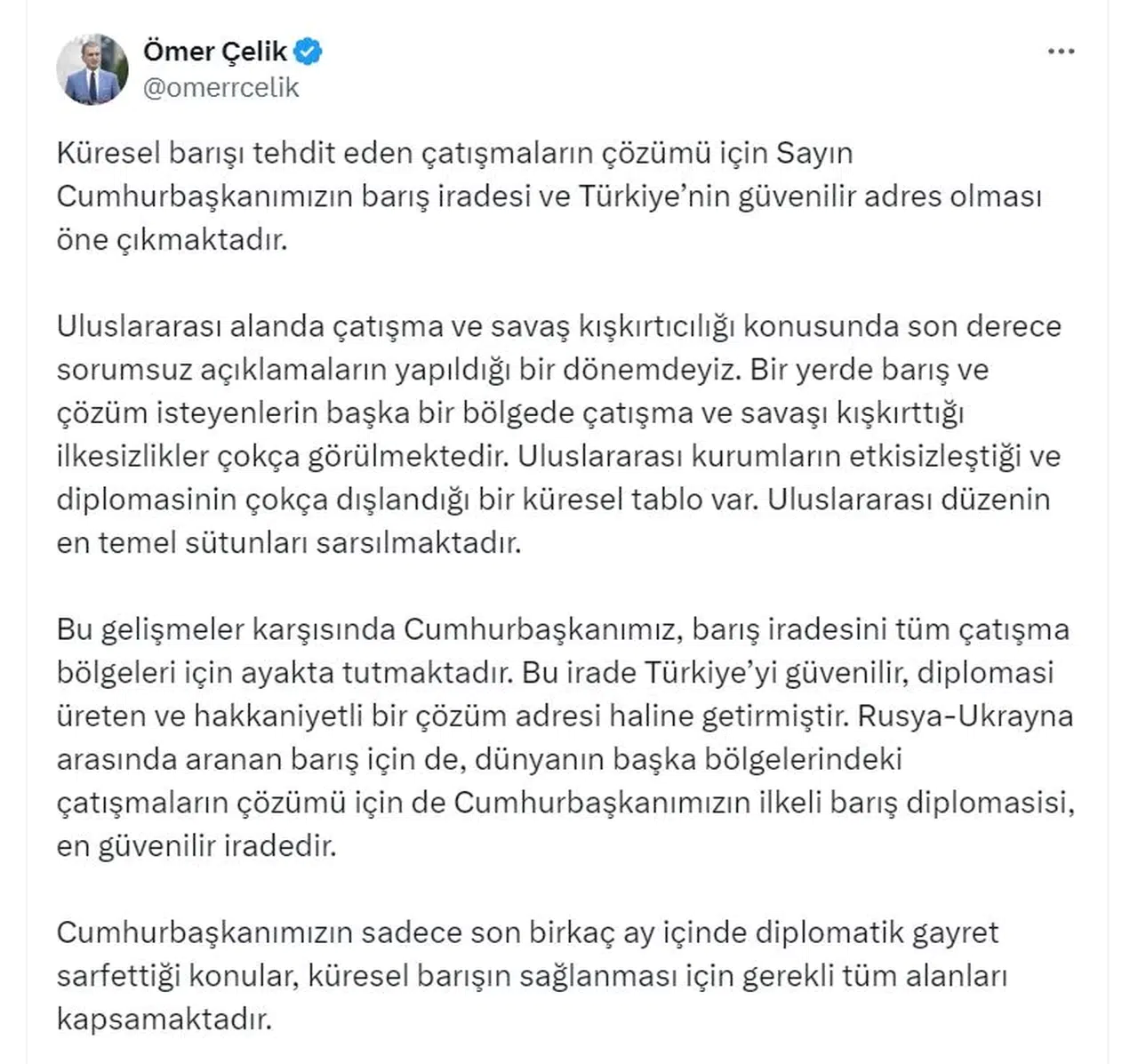 AK Parti Sözcüsü Çelik, sosyal medya hesabından yaptığı açıklamada, "Küresel barışı tehdit eden çatışmaların çözümü için Sayın Cumhurbaşkanımızın barış iradesi ve Türkiye'nin güvenilir adres olması öne çıkmaktadır. Uluslararası alanda çatışma ve savaş kışkırtıcılığı konusunda son derece sorumsuz açıklamaların yapıldığı bir dönemdeyiz. Bir yerde barış ve çözüm isteyenlerin başka bir bölgede çatışma ve savaşı kışkırttığı ilkesizlikler çokça görülmektedir. Uluslararası kurumların etkisizleştiği ve diplomasinin çokça dışlandığı bir küresel tablo var. Uluslararası düzenin en temel sütunları sarsılmaktadır" ifadelerini kullandı.