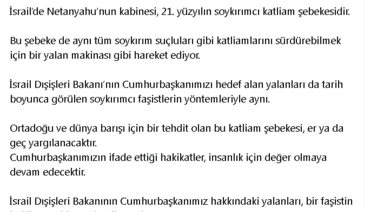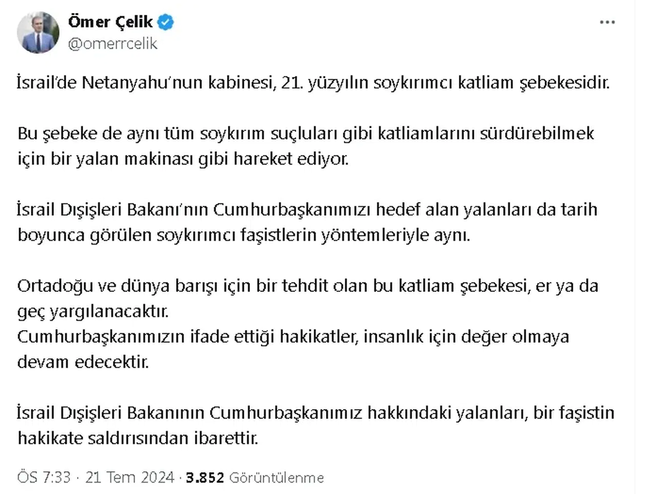 AK Parti sözcüsü Ömer çelik sosyal medya hesabından paylaşım yaparak, "İsrail’de Netanyahu’nun kabinesi, 21'inci yüzyılın soykırımcı katliam şebekesidir. Bu şebeke de aynı tüm soykırım suçluları gibi katliamlarını sürdürebilmek için bir yalan makinası gibi hareket ediyor. İsrail Dışişleri Bakanı’nın Cumhurbaşkanımızı hedef alan yalanları da tarih boyunca görülen soykırımcı faşistlerin yöntemleriyle aynı. Ortadoğu ve dünya barışı için bir tehdit olan bu katliam şebekesi, er ya da geç yargılanacaktır. Cumhurbaşkanımızın ifade ettiği hakikatler, insanlık için değer olmaya devam edecektir. İsrail Dışişleri Bakanının Cumhurbaşkanımız hakkındaki yalanları, bir faşistin hakikate saldırısından ibarettir" ifadelerini kullandı. (DHA)