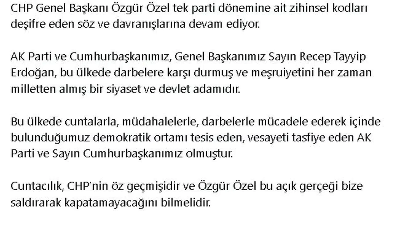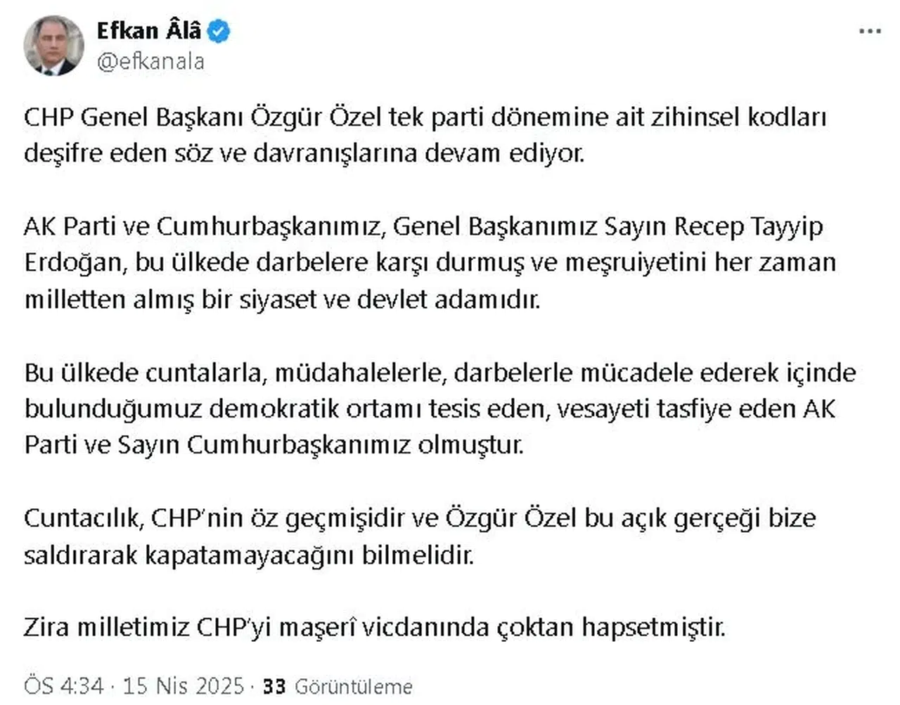 ANKARA, (DHA)- AK Parti Genel Başkan Vekili Efkan Ala, "Cuntacılık, CHP'nin öz geçmişidir ve Özgür Özel bu açık gerçeği bize saldırarak kapatamayacağını bilmelidir. Zira milletimiz CHP'yi maşeri vicdanında çoktan hapsetmiştir" dedi.