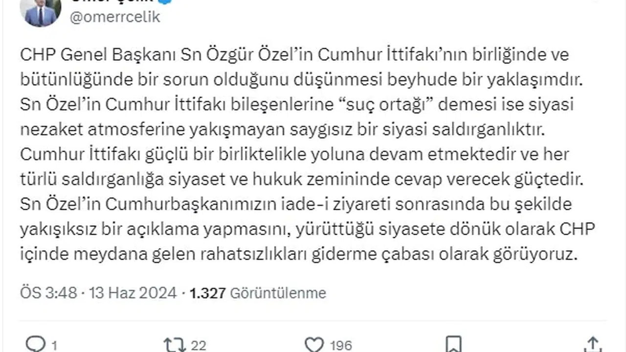 AK Parti'li Çelik, sosyal medya hesabından yaptığı açıklamada, "CHP Genel Başkanı Sayın Özgür Özel’in Cumhur İttifakı’nın birliğinde ve bütünlüğünde bir sorun olduğunu düşünmesi beyhude bir yaklaşımdır. Sayın Özel’in Cumhur İttifakı bileşenlerine 'suç ortağı' demesi ise siyasi nezaket atmosferine yakışmayan saygısız bir siyasi saldırganlıktır. Cumhur İttifakı güçlü bir birliktelikle yoluna devam etmektedir ve her türlü saldırganlığa siyaset ve hukuk zemininde cevap verecek güçtedir. Sayın Özel’in Cumhurbaşkanımızın iade-i ziyareti sonrasında bu şekilde yakışıksız bir açıklama yapmasını, yürüttüğü siyasete dönük olarak CHP içinde meydana gelen rahatsızlıkları giderme çabası olarak görüyoruz" ifadelerini kullandı. (DHA)