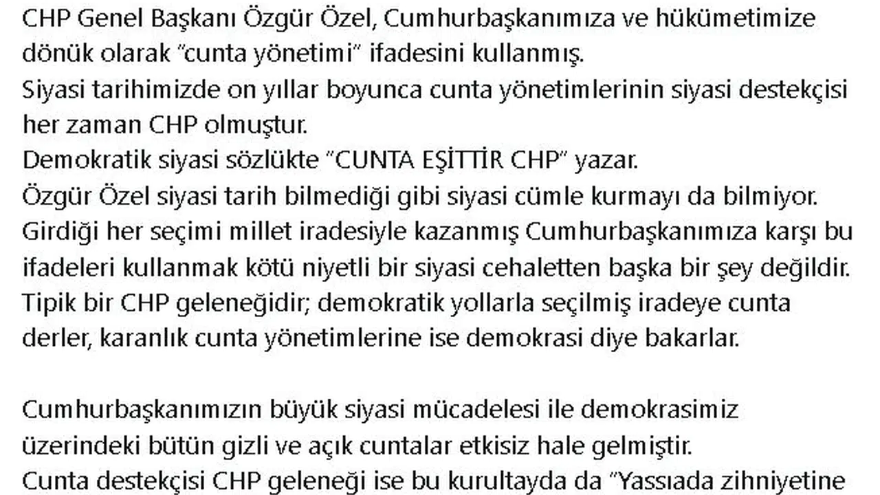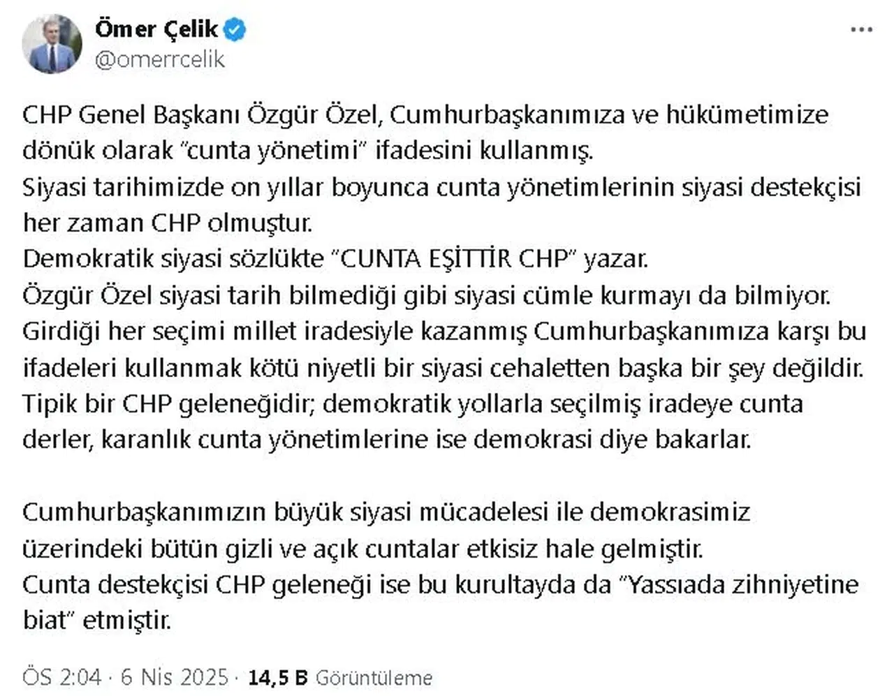 AK Parti'li Ömer Çelik, sosyal medya hesabından yaptığı açıklamada, "CHP Genel Başkanı Özgür Özel, Cumhurbaşkanımıza ve hükümetimize dönük olarak 'cunta yönetimi' ifadesini kullanmış. Siyasi tarihimizde on yıllar boyunca cunta yönetimlerinin siyasi destekçisi her zaman CHP olmuştur. Demokratik siyasi sözlükte 'cunta eşittir CHP' yazar. Özgür Özel siyasi tarih bilmediği gibi siyasi cümle kurmayı da bilmiyor. Girdiği her seçimi millet iradesiyle kazanmış Cumhurbaşkanımıza karşı bu ifadeleri kullanmak kötü niyetli bir siyasi cehaletten başka bir şey değildir. Tipik bir CHP geleneğidir; demokratik yollarla seçilmiş iradeye 'Cunta' derler, karanlık cunta yönetimlerine ise demokrasi diye bakarlar. Cumhurbaşkanımızın büyük siyasi mücadelesi ile demokrasimiz üzerindeki bütün gizli ve açık cuntalar etkisiz hale gelmiştir. Cunta destekçisi CHP geleneği ise bu kurultayda da Yassıada zihniyetine biat etmiştir" ifadelerini kullandı. (DHA)