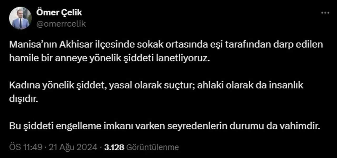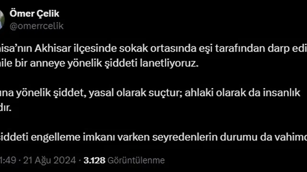 ANKARA, (DHA)- AK Parti Sözcüsü Ömer Çelik, "Manisa’nın Akhisar ilçesinde sokak ortasında eşi tarafından darp edilen hamile bir anneye yönelik şiddeti lanetliyoruz" açıklamasında bulundu.