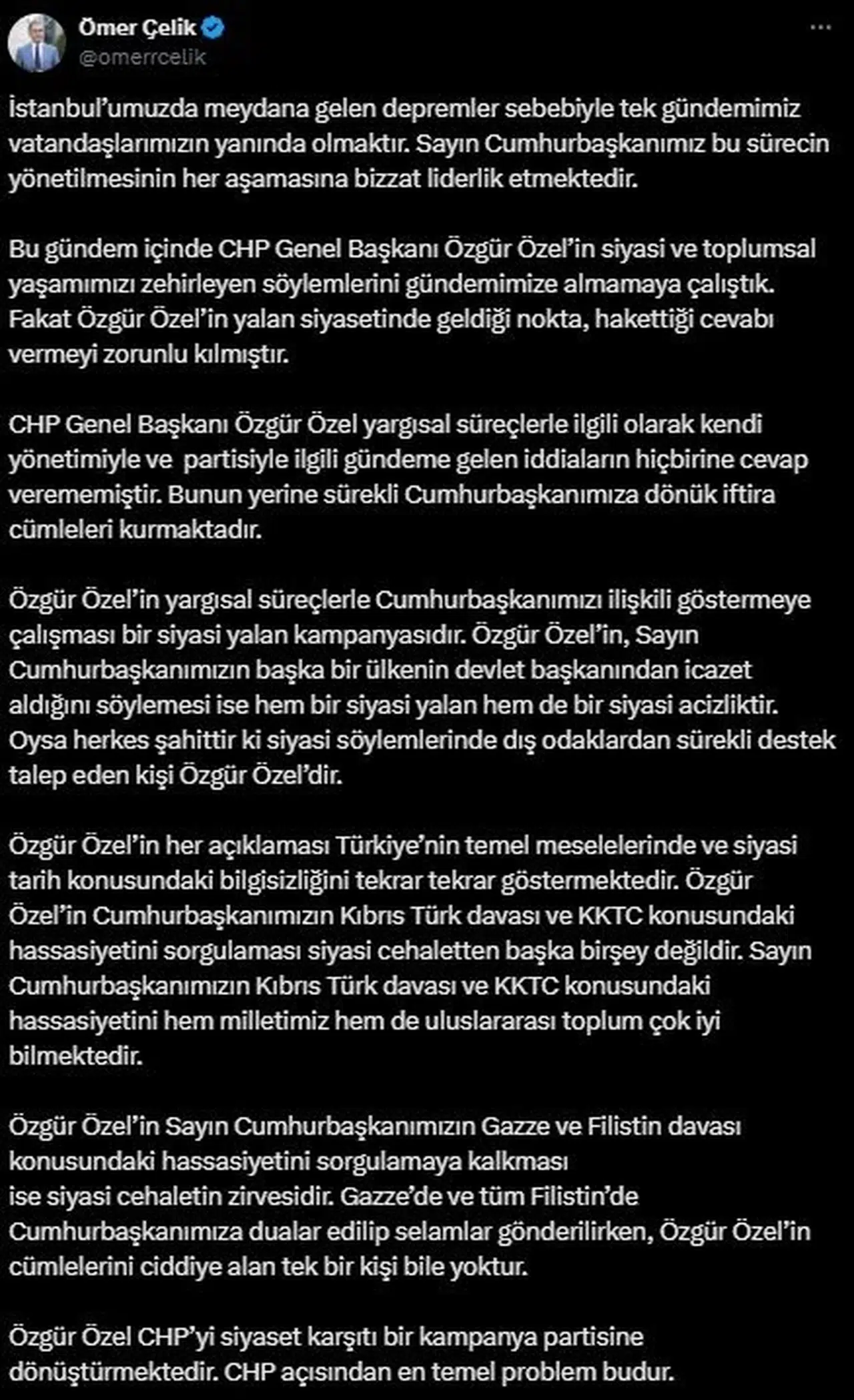 AK Parti Sözcüsü Ömer Çelik, sosyal medya hesabından yaptığı açıklamada, "İstanbul’umuzda meydana gelen depremler sebebiyle tek gündemimiz vatandaşlarımızın yanında olmaktır. Sayın Cumhurbaşkanımız bu sürecin yönetilmesinin her aşamasına bizzat liderlik etmektedir. Bu gündem içinde CHP Genel Başkanı Özgür Özel’in siyasi ve toplumsal yaşamımızı zehirleyen söylemlerini gündemimize almamaya çalıştık. Fakat Özgür Özel’in yalan siyasetinde geldiği nokta, hak ettiği cevabı vermeyi zorunlu kılmıştır. CHP Genel Başkanı Özgür Özel yargısal süreçlerle ilgili olarak kendi yönetimiyle ve partisiyle ilgili gündeme gelen iddiaların hiçbirine cevap verememiştir. Bunun yerine sürekli Cumhurbaşkanımıza dönük iftira cümleleri kurmaktadır. Özgür Özel’in yargısal süreçlerle Cumhurbaşkanımızı ilişkili göstermeye çalışması bir siyasi yalan kampanyasıdır. Özgür Özel’in, Sayın Cumhurbaşkanımızın başka bir ülkenin devlet başkanından icazet aldığını söylemesi ise hem bir siyasi yalan, hem de bir siyasi acizliktir. Oysa herkes şahittir ki siyasi söylemlerinde dış odaklardan sürekli destek talep eden kişi Özgür Özel’dir. Özgür Özel’in her açıklaması Türkiye’nin temel meselelerinde ve siyasi tarih konusundaki bilgisizliğini tekrar tekrar göstermektedir. Özgür Özel’in Cumhurbaşkanımızın Kıbrıs Türk davası ve KKTC konusundaki hassasiyetini sorgulaması siyasi cehaletten başka bir şey değildir. Sayın Cumhurbaşkanımızın Kıbrıs Türk davası ve KKTC konusundaki hassasiyetini hem milletimiz, hem de uluslararası toplum çok iyi bilmektedir. Özgür Özel’in Sayın Cumhurbaşkanımızın Gazze ve Filistin davası konusundaki hassasiyetini sorgulamaya kalkması ise siyasi cehaletin zirvesidir. Gazze’de ve tüm Filistin’de Cumhurbaşkanımıza dualar edilip selamlar gönderilirken, Özgür Özel’in cümlelerini ciddiye alan tek bir kişi bile yoktur. Özgür Özel, CHP’yi siyaset karşıtı bir kampanya partisine dönüştürmektedir. CHP açısından en temel problem budur" dedi. (DHA)