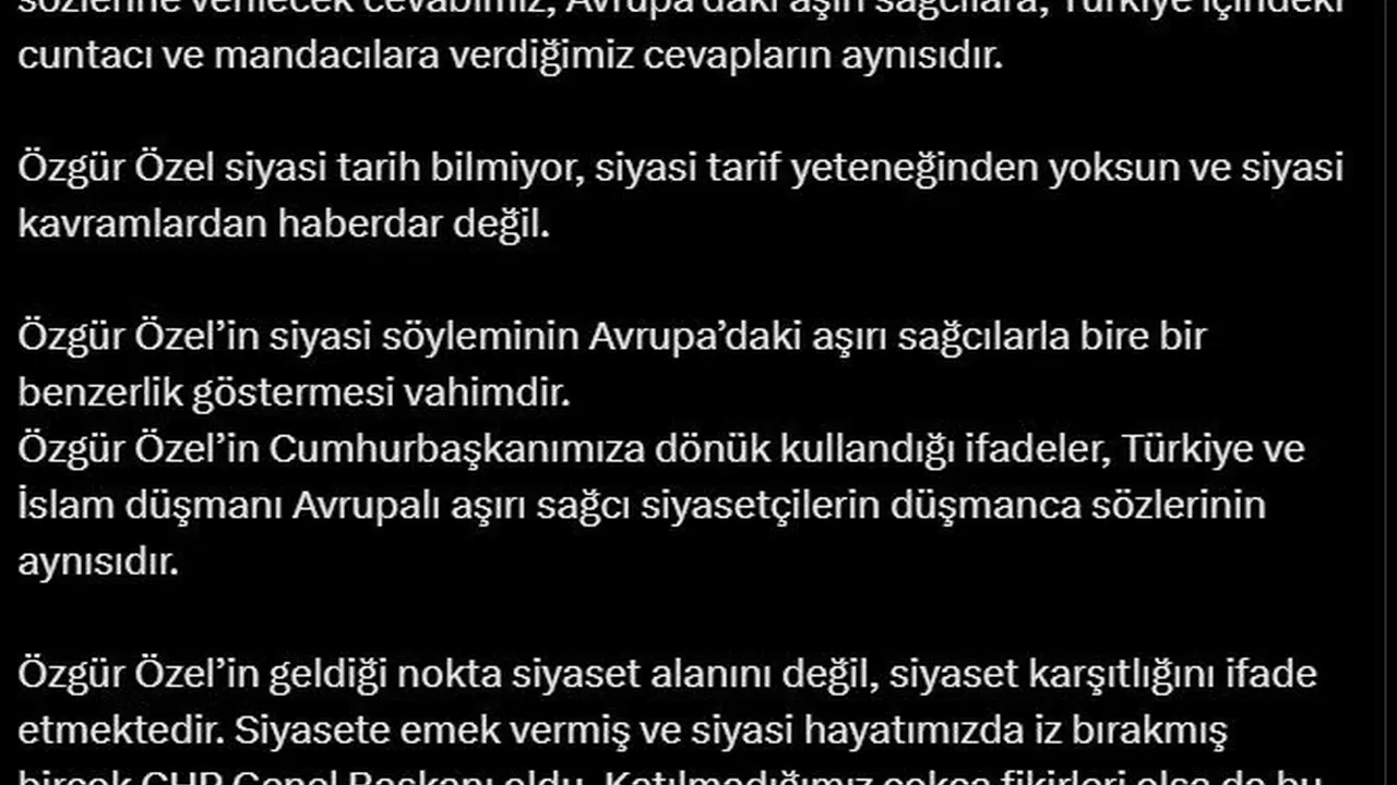 AK Parti Sözcüsü Çelik, sosyal medya hesabından yaptığı açıklamada, "CHP Genel Başkanı Özgür Özel’in Cumhurbaşkanımıza dönük çirkin sözlerine verilecek cevabımız, Avrupa’daki aşırı sağcılara, Türkiye içindeki cuntacı ve mandacılara verdiğimiz cevapların aynısıdır. Özgür Özel siyasi tarih bilmiyor, siyasi tarif yeteneğinden yoksun ve siyasi kavramlardan haberdar değil. Özgür Özel’in siyasi söyleminin Avrupa’daki aşırı sağcılarla bire bir benzerlik göstermesi vahimdir. Özgür Özel’in Cumhurbaşkanımıza dönük kullandığı ifadeler, Türkiye ve İslam düşmanı Avrupalı aşırı sağcı siyasetçilerin düşmanca sözlerinin aynısıdır. Özgür Özel’in geldiği nokta siyaset alanını değil, siyaset karşıtlığını ifade etmektedir. Siyasete emek vermiş ve siyasi hayatımızda iz bırakmış birçok CHP Genel Başkanı oldu. Katılmadığımız çokça fikirleri olsa da bu genel başkanların çeşitli siyasi meselelerde nitelikli yaklaşımlarına şahit olduk. Özgür Özel’in geldiği nokta ise tamamen niteliksiz siyasetin markası oldu" ifadelerini kullandı. (DHA)