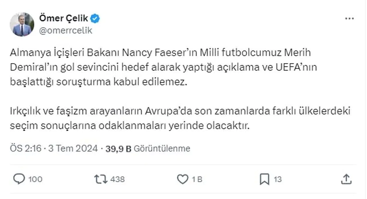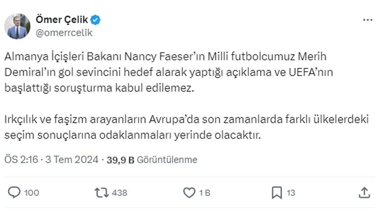 Ömer Çelik, sosyal medya hesabından yaptığı açıklamada, "Almanya İçişleri Bakanı Nancy Faeser’ın, milli futbolcumuz Merih Demiral’ın gol sevincini hedef alarak yaptığı açıklama ve UEFA’nın başlattığı soruşturma kabul edilemez. Irkçılık ve faşizm arayanların Avrupa’da son zamanlarda farklı ülkelerdeki seçim sonuçlarına odaklanmaları yerinde olacaktır" ifadelerini kullandı. (DHA)