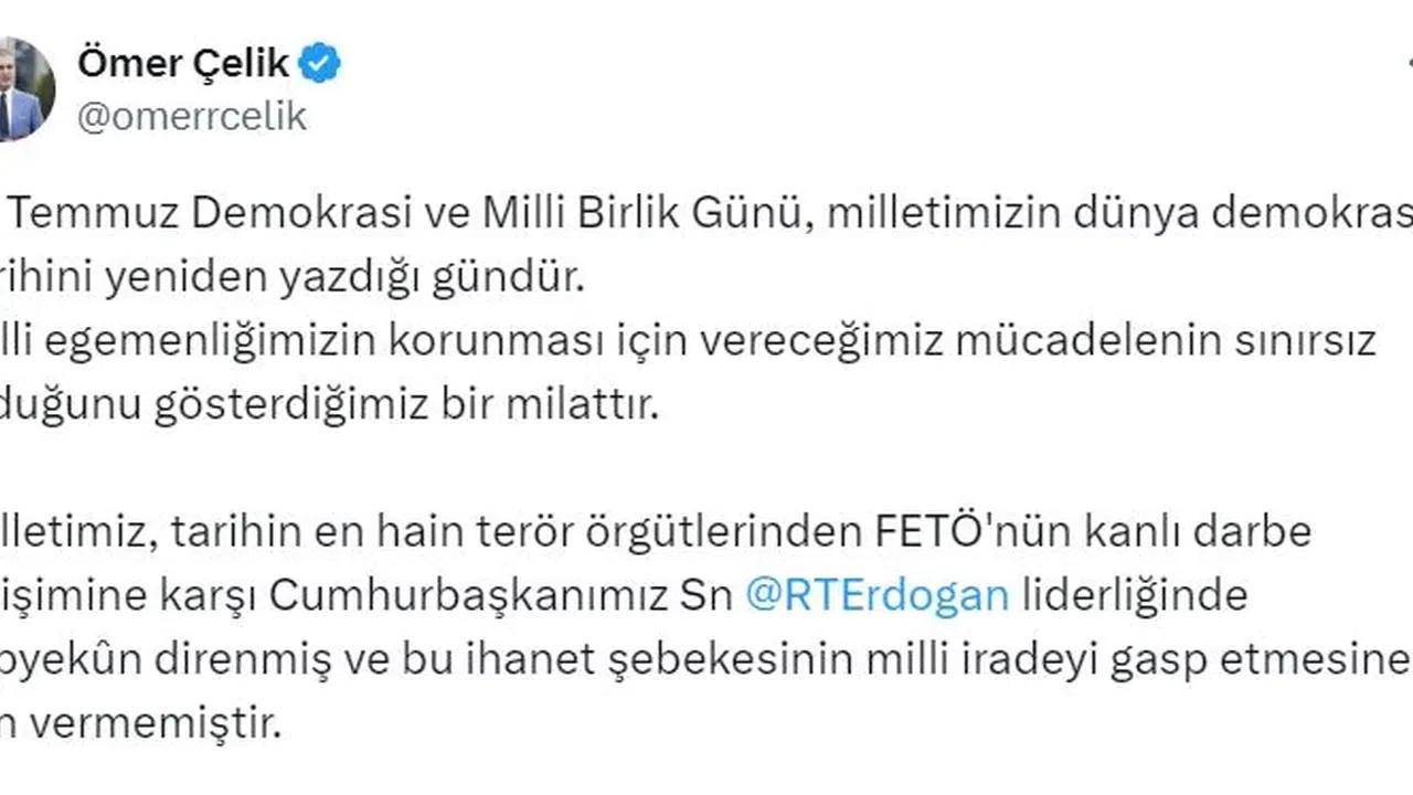 ANKARA, (DHA)- AK Parti Genel Başkan Yardımcısı ve Parti Sözcüsü Ömer Çelik, "15 Temmuz Demokrasi ve Milli Birlik Günü, milletimizin dünya demokrasi tarihini yeniden yazdığı gündür. Milli egemenliğimizin korunması için vereceğimiz mücadelenin sınırsız olduğunu gösterdiğimiz bir milattır" dedi.