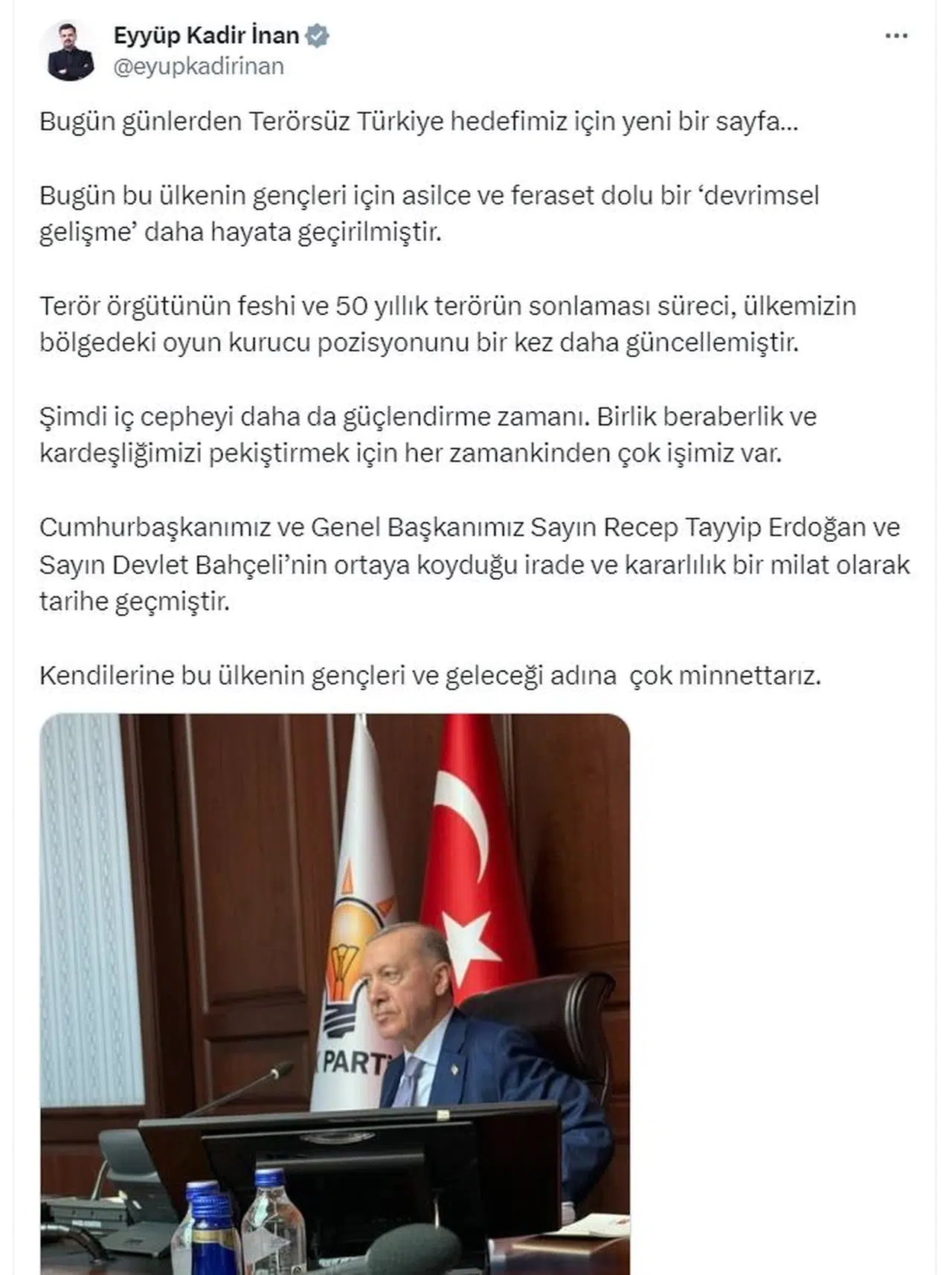 ANKARA, (DHA)- AK Parti Genel Sekreteri ve İzmir Milletvekili Eyyüp Kadir İnan, "Terör örgütünün feshi ve 50 yıllık terörün sonlaması süreci, ülkemizin bölgedeki oyun kurucu pozisyonunu bir kez daha güncellemiştir. Şimdi iç cepheyi daha da güçlendirme zamanı. Birlik beraberlik ve kardeşliğimizi pekiştirmek için her zamankinden çok işimiz var" dedi.