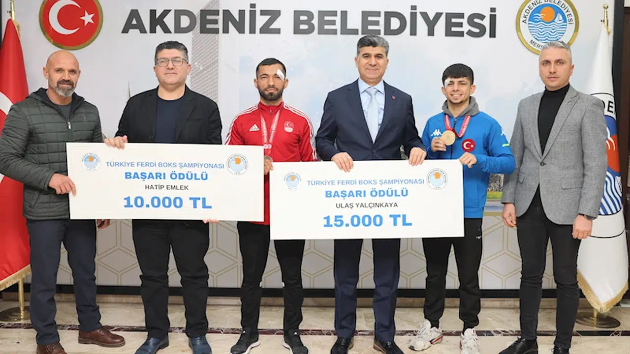 Konya’da düzenlenen Büyük Erkekler Türkiye Ferdi Boks Şampiyonası’nda büyük başarılar elde eden Akdeniz Belediyesi Spor Kulübü sporcuları, memleketlerine gururla döndü. 51 kiloda Türkiye şampiyonu olarak altın madalya kazanan sporculardan Ulaş Yalçınkaya ve 57 kiloda Türkiye üçüncüsü olarak bronz madalya kazanan sporcu Hatip Emlek, Akdeniz Kaymakamı ve Belediye Başkan Vekili Zeyit Şener’i makamında ziyaret etti.