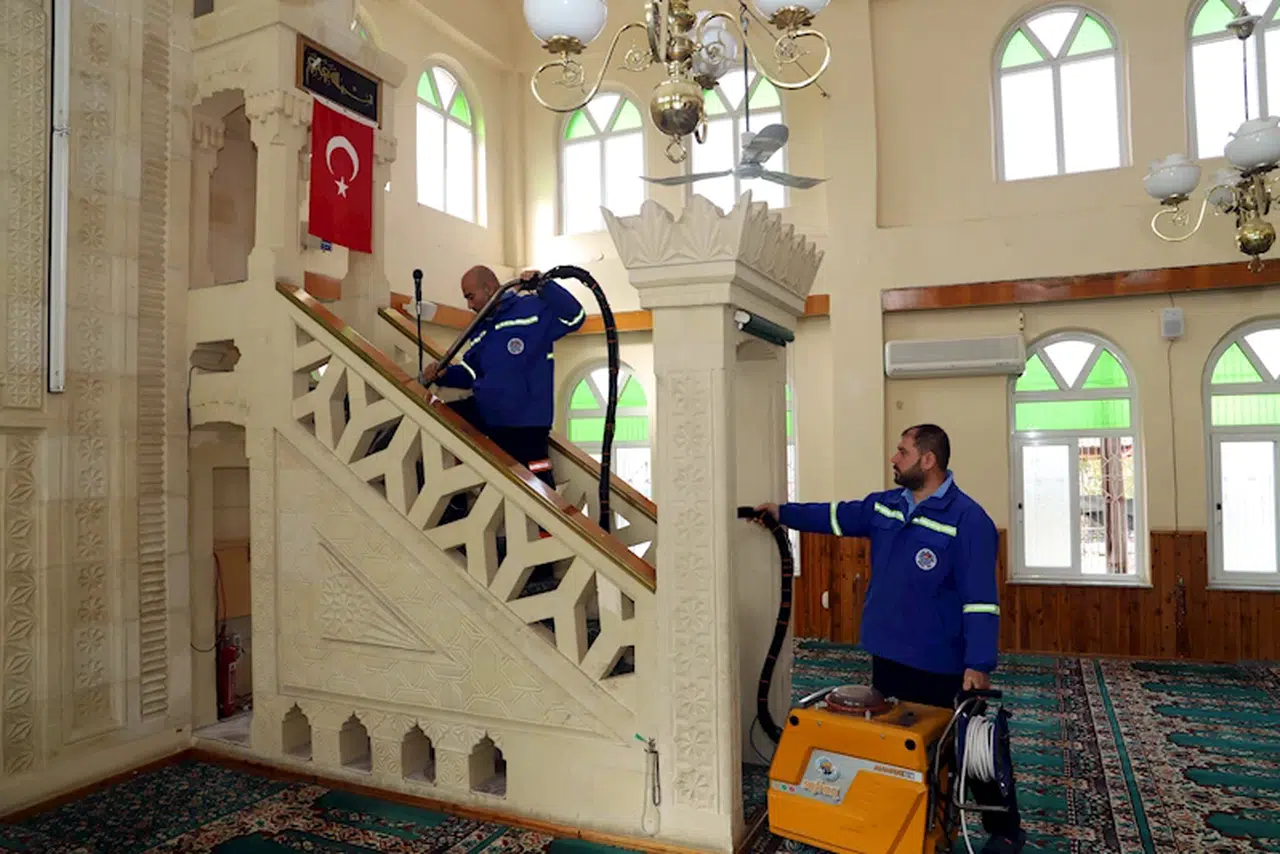 Mübarek Ramazan ayı ile birlikte belediye ekipleri, Akdeniz ilçe sınırları içerisinde bulunan camilerde yoğun temizlik operasyonu yürütüyor. Bu iş için özel olarak hazırlanan araç, gereç ve ekipmanlarla çalışan mobil temizlik ekibi, camilerde bulunan halıları ıslak ve kuru temizleme yöntemleriyle her türlü toz ve kirden arındırarak ilk günkü gibi temiz bir hale gelmesini sağlıyor. Camileri köşe bucak temizleyen belediye ekipleri, cami girişi ve bahçesini de detaylı bir şekilde temizleyip pırıl pırıl bir hale getiriyor.